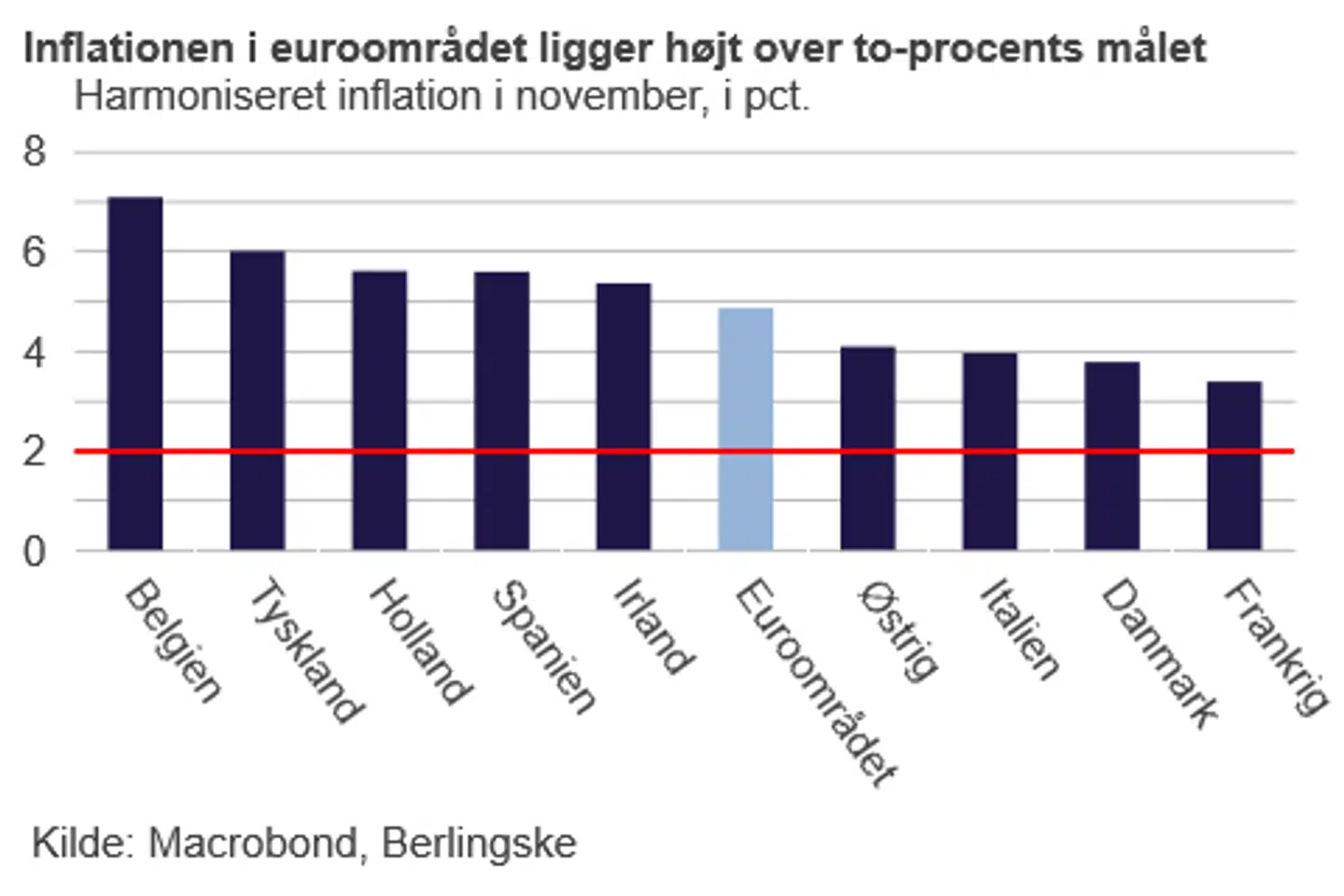 Derfor forventer Polack heller ikke, at ECB inden for den nærmeste fremtid følger med de andre centralbanker og begynder at stramme op. Og det er til trods for, at Tyskland har en af de højeste inflationsrater i euroområdet på seks procent. Til sammenligning ligger den i Danmark på 3,4 procent: