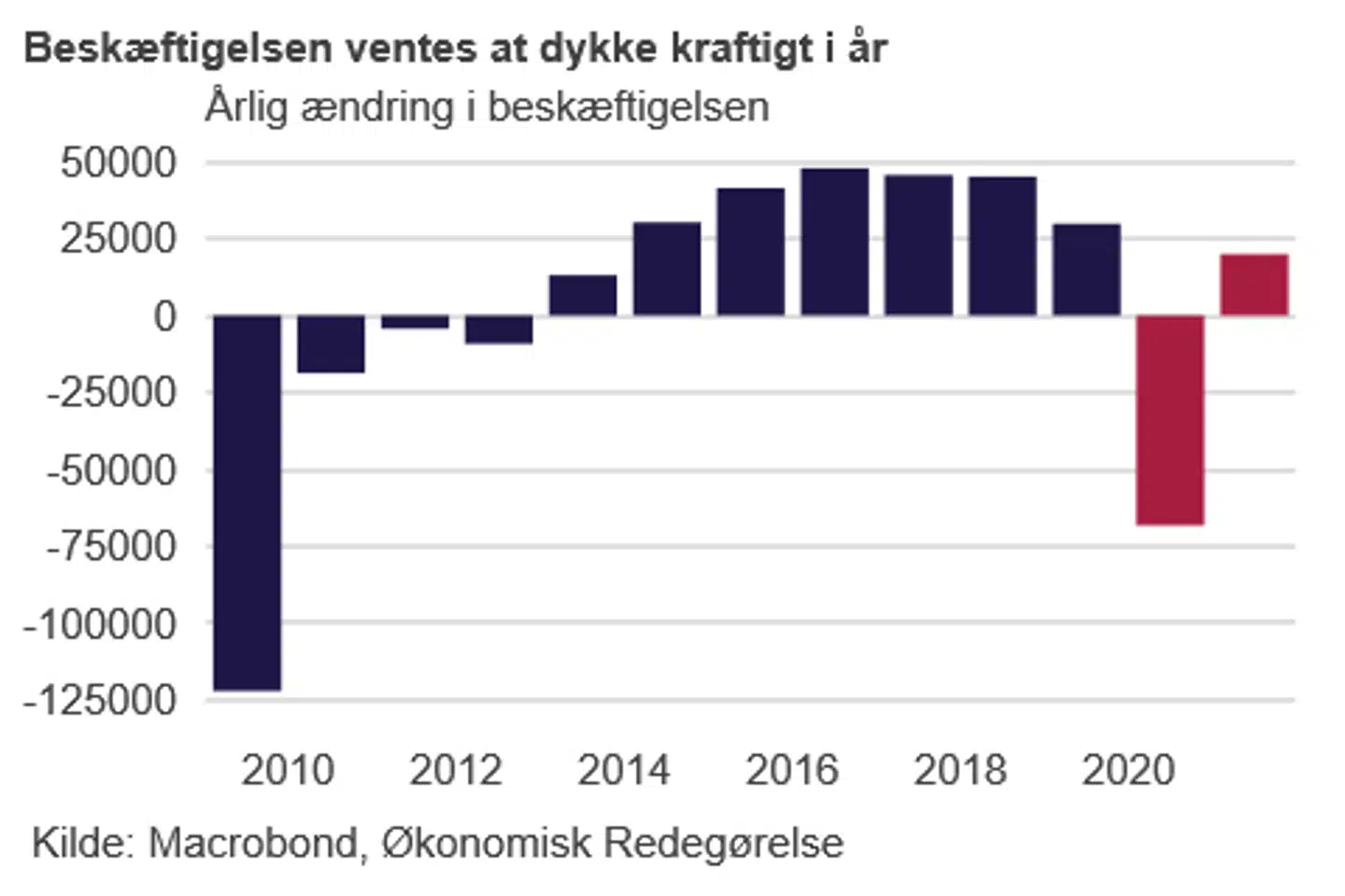 Samtidig bebuder rapporten, at det vil komme til at tage rigtigt lang tid at indhente det tabte. Tidligst i 2022 vil vi være tilbage på det rekordhøje niveau på 2.803.860 personer, som beskæftigelsen ramte i februar.