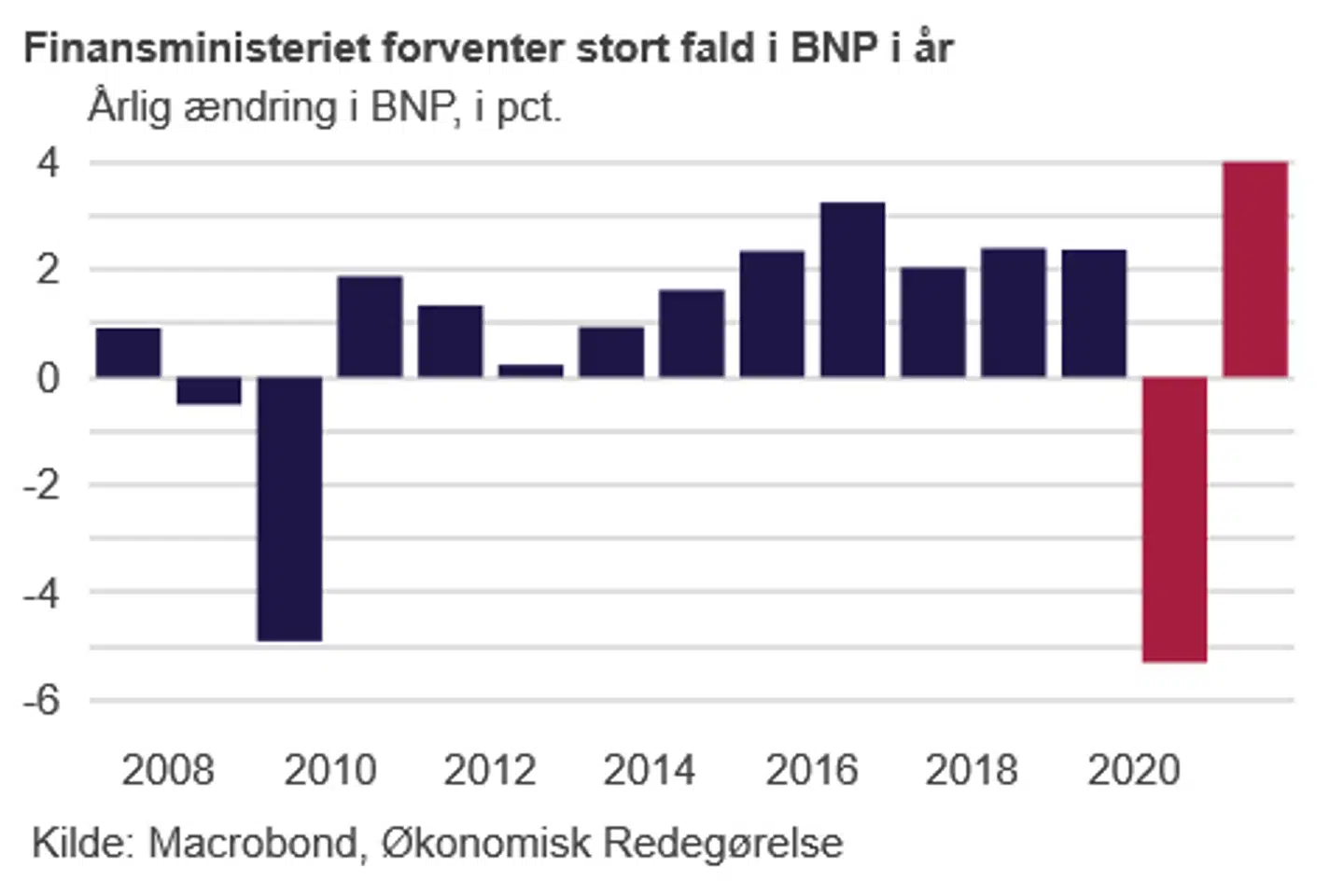 De nye tal fremgår af Økonomiske Redegørelse, som regeringen med finansminister Nicolai Wammen (S) i spidsen kom med tirsdag. I begyndelsen af april kom regeringen med en foreløbig prognose for den danske økonomi under coronakrisen. Heri blev opstillet tre scenarier, der viste, at vi vil få et fald i vores produktion i år på mellem tre pct. og seks pct. I den nye redegørelse forudser regeringen, at væksten i år vil falde med 5,3 pct.