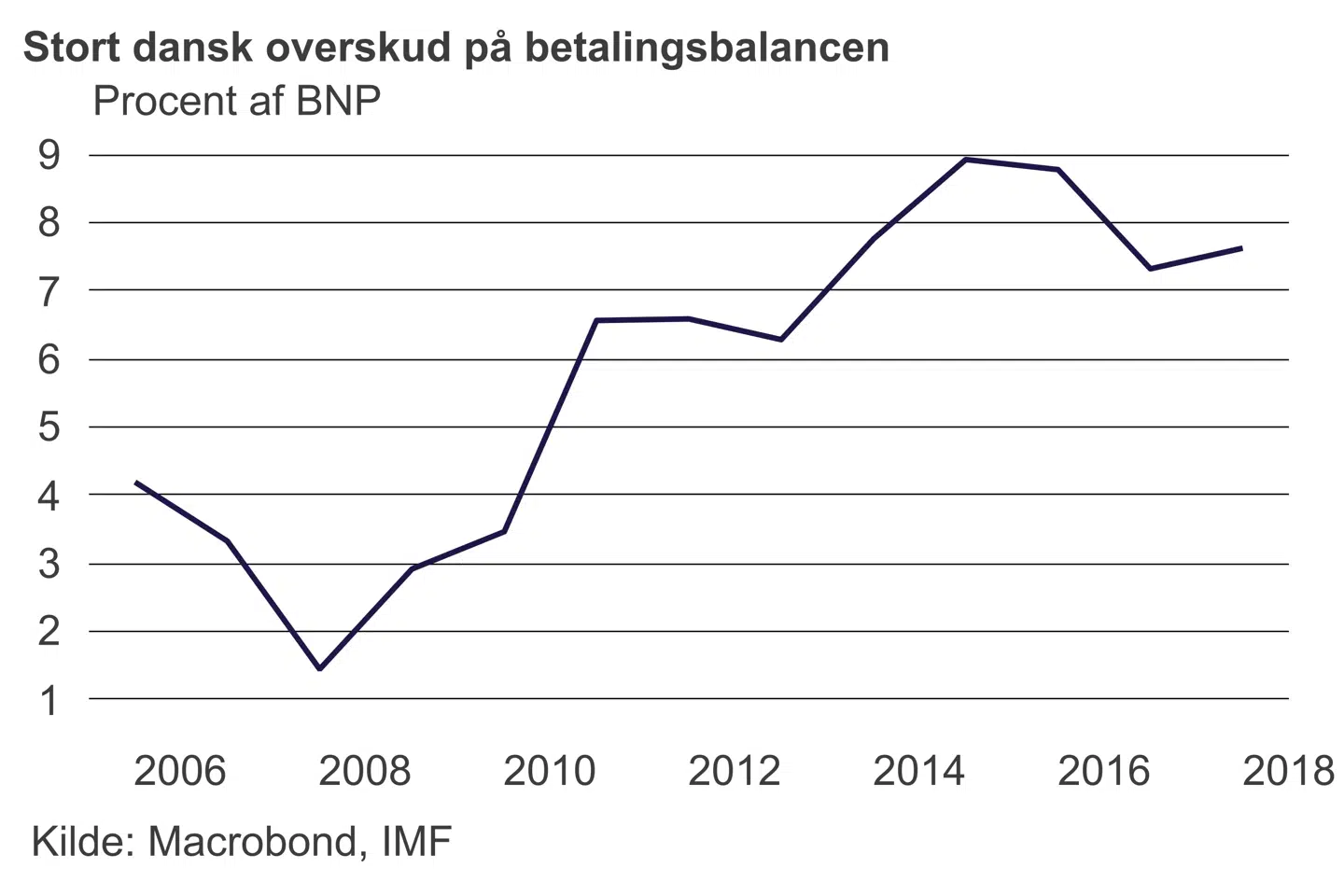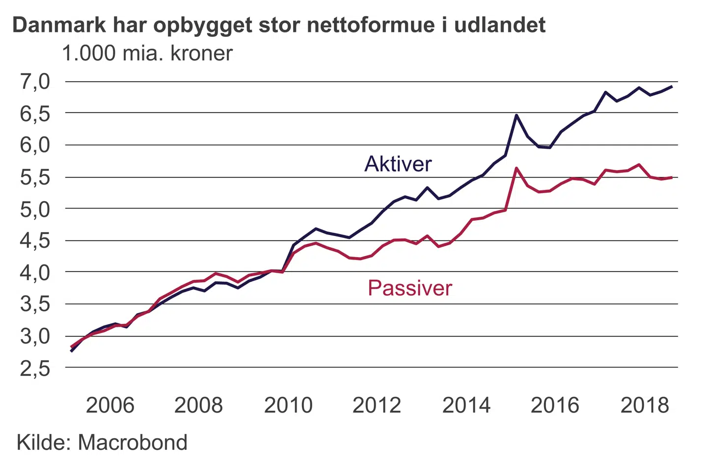 Tidligere havde vi i Danmark solide problemer med store underskud på betalingsbalancen. Men danskerne er gennem en årrække blevet tvunget til at spare op til pension via overenskomster, og det har været med til at løse det problem. Tilbage ved indgangen til 2010erne begyndte så for alvor den nye æra for dansk økonomi, hvor vi fik nettoformue over for udlandet i stedet for nettogæld.