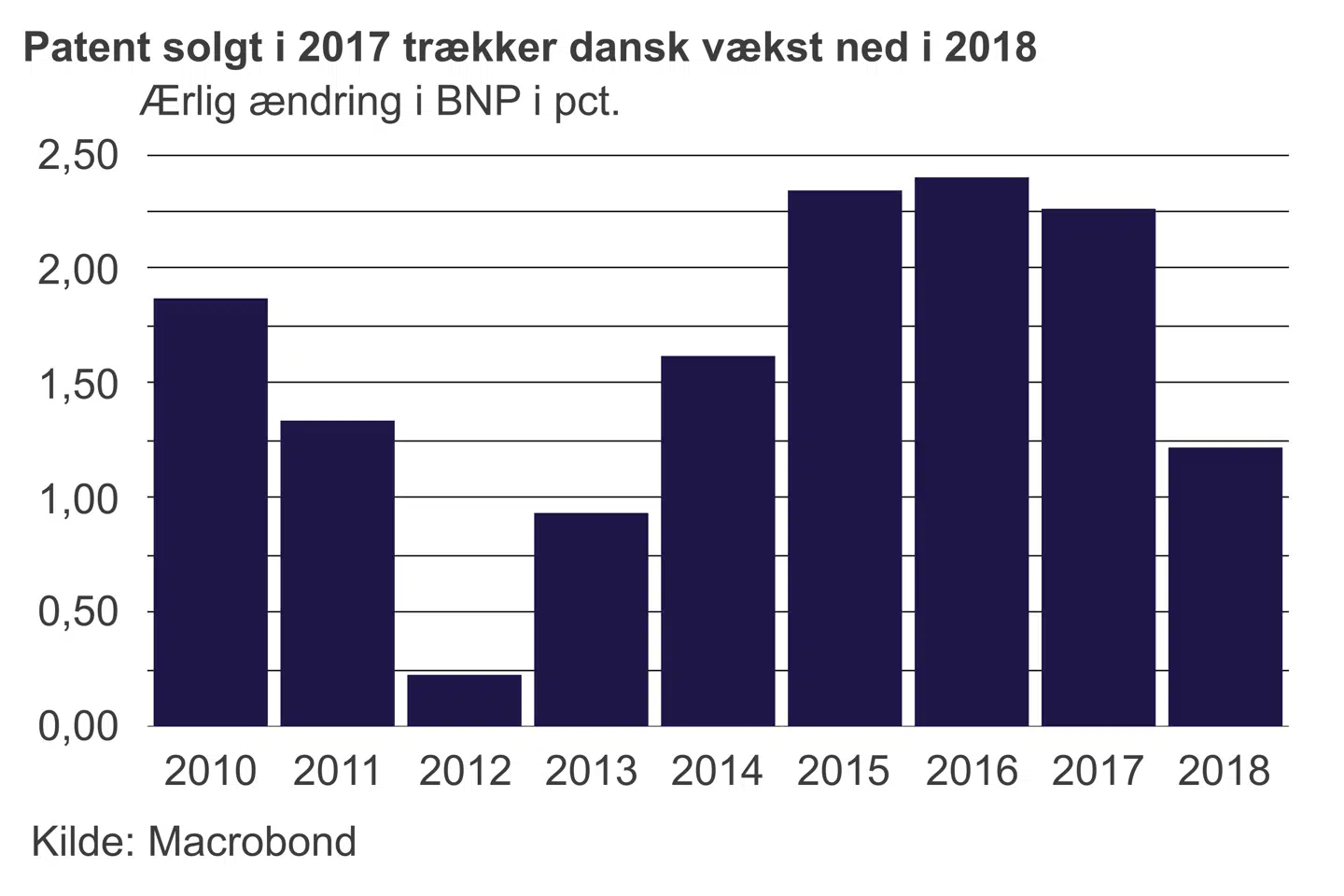 »En del af forklaringen er den varme og tørre sommer, der blandt andet betød dårlig høst. Hvis 2019 bliver mere normal, vil det give tilsvarende højere vækst i år. En anden del af forklaringen er det kunstigt høje BNP for 2017, hvor Danmarks Statistik har indregnet en produktion på biotekområdet, selv om den helt klart ikke fandt sted det år. Det vil på et tidspunkt blive revideret, og når det sker, vil det løfte væksttallet for 2018 med cirka 0,4 procentpoint,« skriver Las Olsen, cheføkonom i Danske Bank, i en kommentar til tallene.