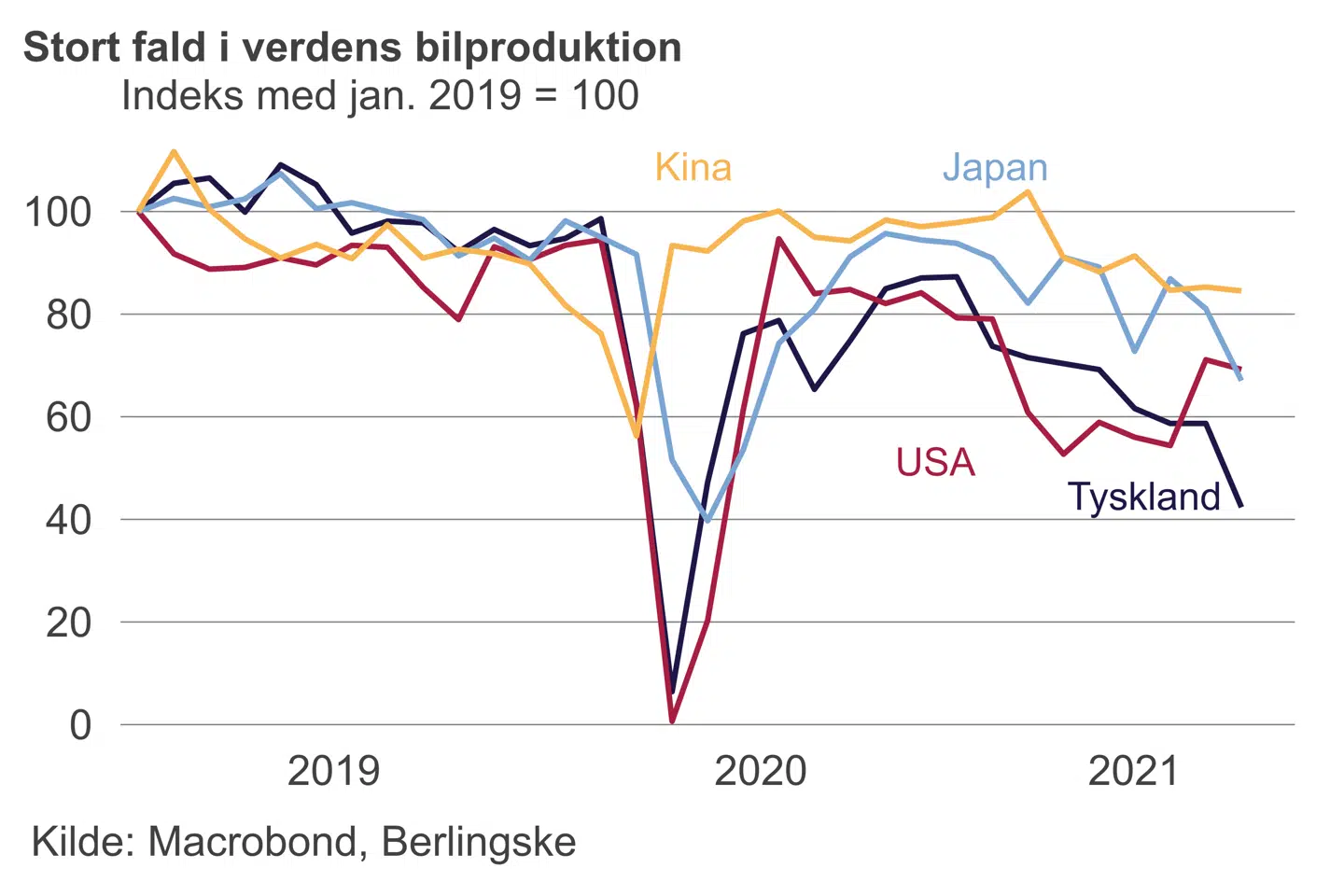 I USA, Storbritannien og Japan var produktionen omkring 30 procent lavere, mens produktionen i Kina indtil nu er sluppet mere nådig med et fald på 15 procent. De store fald i år kommer, efter at den globale produktion i coronaåret 2020 faldt med 17 procent. Herhjemme lå salget af nye biler i sommermånederne 13 procent lavere end samme tid i 2019.