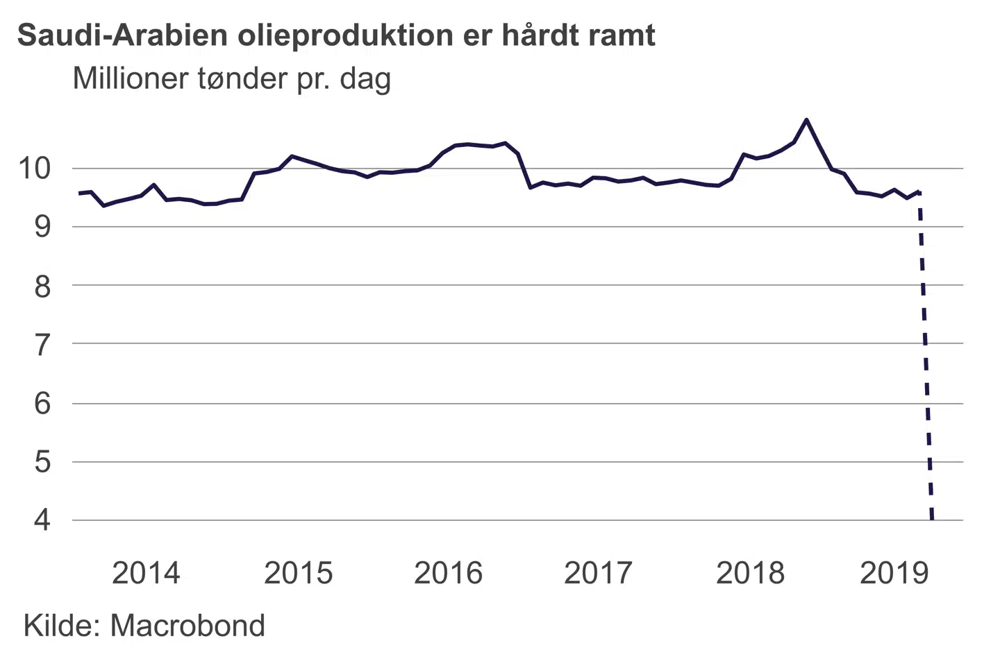 Olieprisen tog et stort hop mandag efter droneangrebet på de saudiske olieanlæg i weekenden. Det vurderes, at den saudiske olieproduktion er reduceret med 5,7 millioner tønder pr. dag, hvilket svarer til ca. fem procent af den globale produktion af råolie og råolieprodukter. Desuden er Saudi-Arabien den eneste olieproducent, der har kapacitet til at udvide produktionen betydeligt. Denne kapacitet er også blevet ramt.