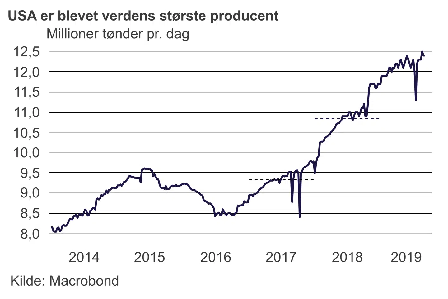I alt er produktionen i Iran og Venezuela halveret siden 2017 med et samlet produktionsfald på 2,9 millioner tønder pr. dag.