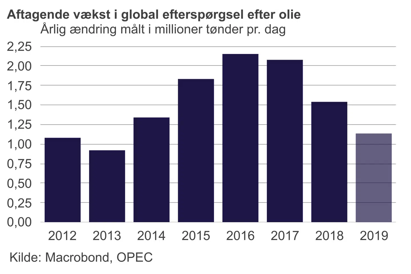 Efterspørgslen efter olie afhænger i høj grad af den økonomiske aktivitet. Mere vækst giver højere efterspørgsel efter olie. De seneste nøgletal fra Kina peger mod en yderligere afmatning i den økonomiske aktivitet, og da Kina er verdens største importør af olie, trækker det ned i den samlede efterspørgsel i verden. OPEC forventer, at væksten i den globale efterspørgsel i år vil være den laveste siden 2013.