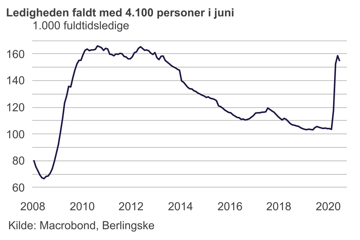 Sådan lyder konklusionen fra økonomer over en bred kam, efter at Danmarks Statistik torsdag formiddag kom med spritnye tal for ledigheden. Opgørelsen viser, at bruttoledigheden faldt fra maj til juni med 4.100 personer. Ledigheden kom derved ned på 5,5 procent. Det sker efter to måneder i træk, hvor pilen har peget kraftigt den anden vej.