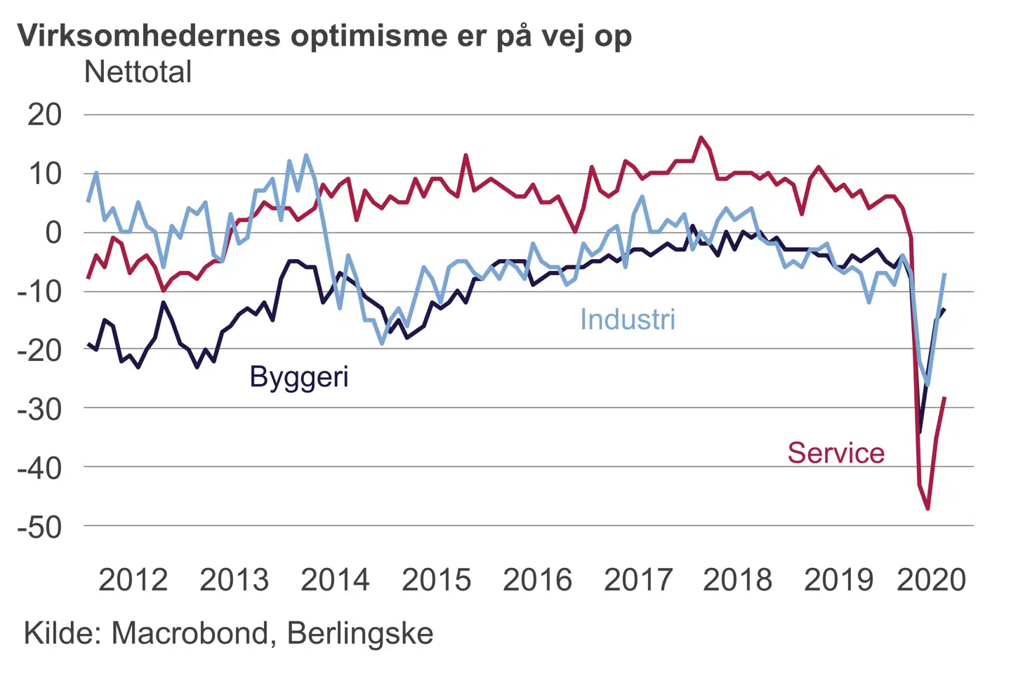 Blandt de positive nyheder kom der torsdag ligeledes tal for virksomhedernes forventninger fra Danmarks Statistik. Det vil sige konjunkturbarometer for både industri, bygge og anlæg, serviceerhverv og detailhandel. Hele vejen rundt var der en stigning i virksomhedernes humør, der dog stiger fra et meget lavt niveau. Specielt serviceerhvervene ligger meget lavt, og med undtagelse af detailhandlen ligger forventningerne i alle brancherne under nul.