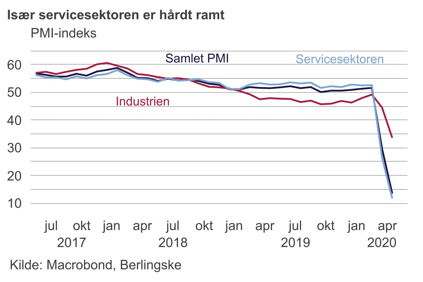 Et PMI-tal under 50 betyder økonomisk tilbagegang, mens en værdi over 50 betyder økonomisk fremgang. Vi skal ikke længere tilbage end til februar, før der var tale om en værdi på over 50.
