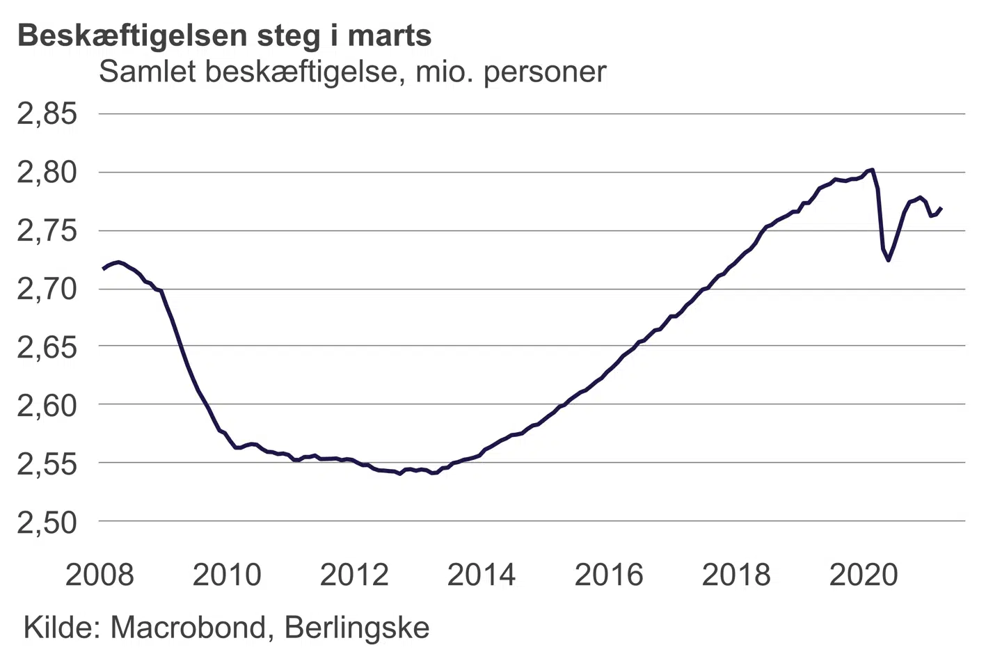 Beskæftigelsen – der af flere økonomer bliver betegnet som »kongetallet« i dansk økonomi – steg med 6.000 personer i marts.