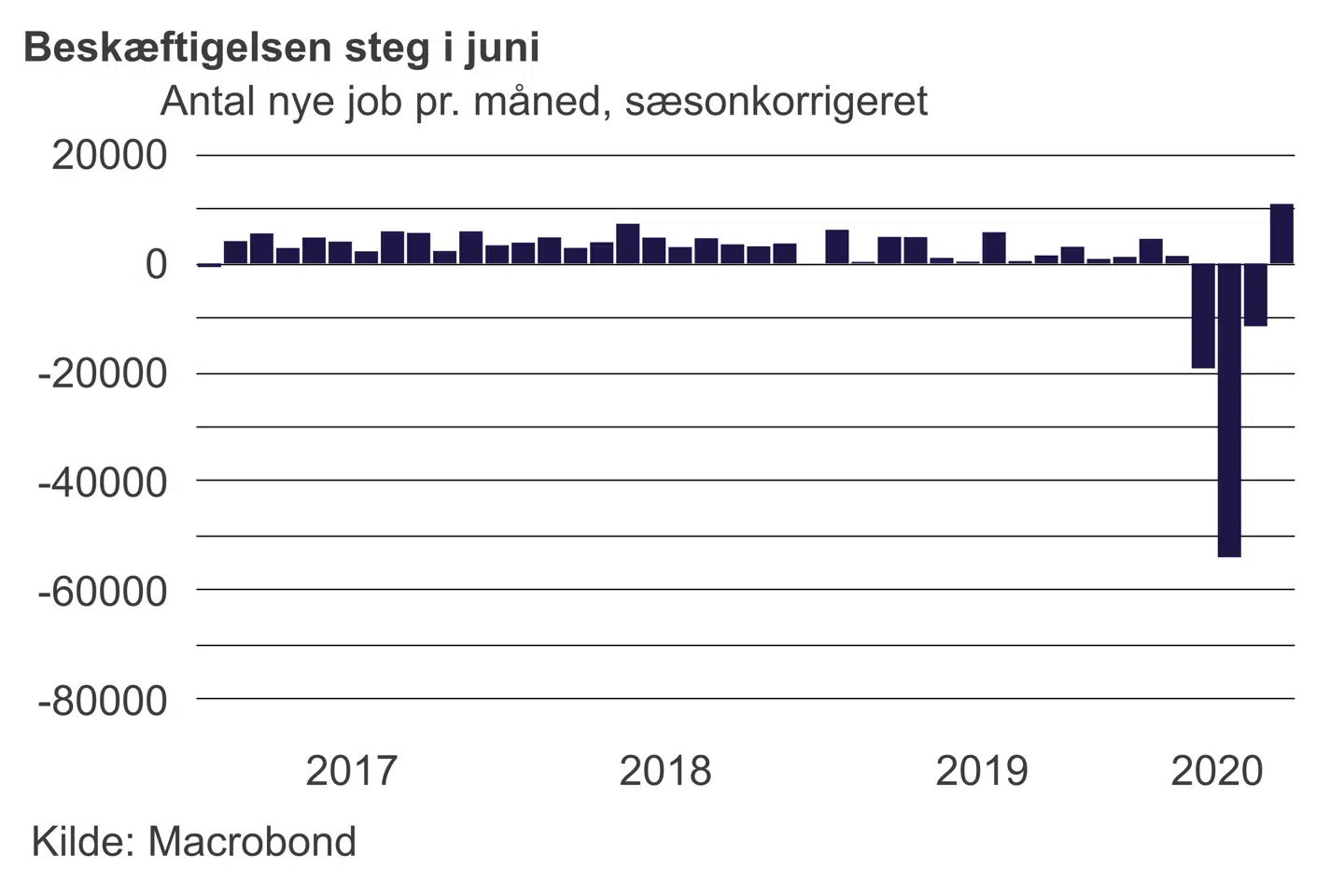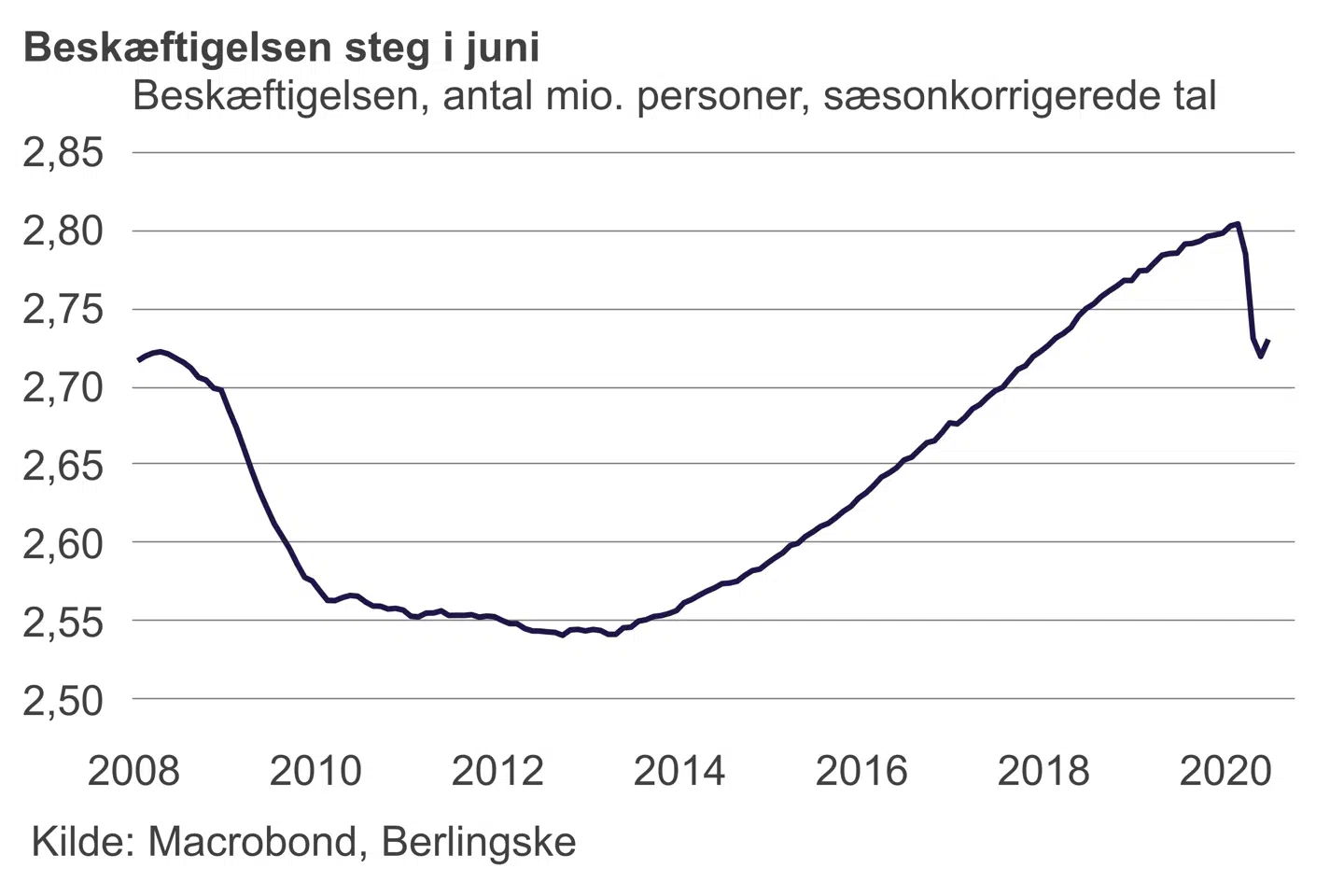 »Den spæde beskæftigelsesstigning i juni betyder dog langtfra, at coronakrisen er afblæst. Vi har hele tiden set krisens dybde som relativt kortvarig, og det ændrer dagens tal ikke en tomme på,« siger han.
