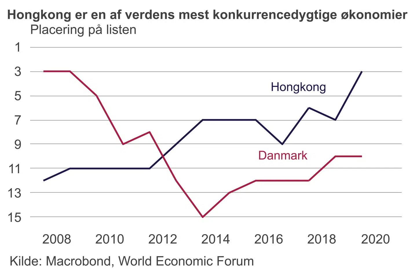Hongkong lå på en tredjeplads i World Economic Forums seneste opgørelse over konkurrenceevne, men Danmark lå som nummer ti. Hongkong lå øverst, når det gælder makroøkonomisk stabilitet (det var før protesterne tog fart), sundhed, effektiviteten af produktmarkeder og det finansielle system. Bystaten scorer højt på næsten alle parametre, undtagen innovation. På Verdensbankens »Doing business«-analyse af, hvor nemt det er at drive virksomhed ligger Hongkong nummer tre – lige foran Danmark.