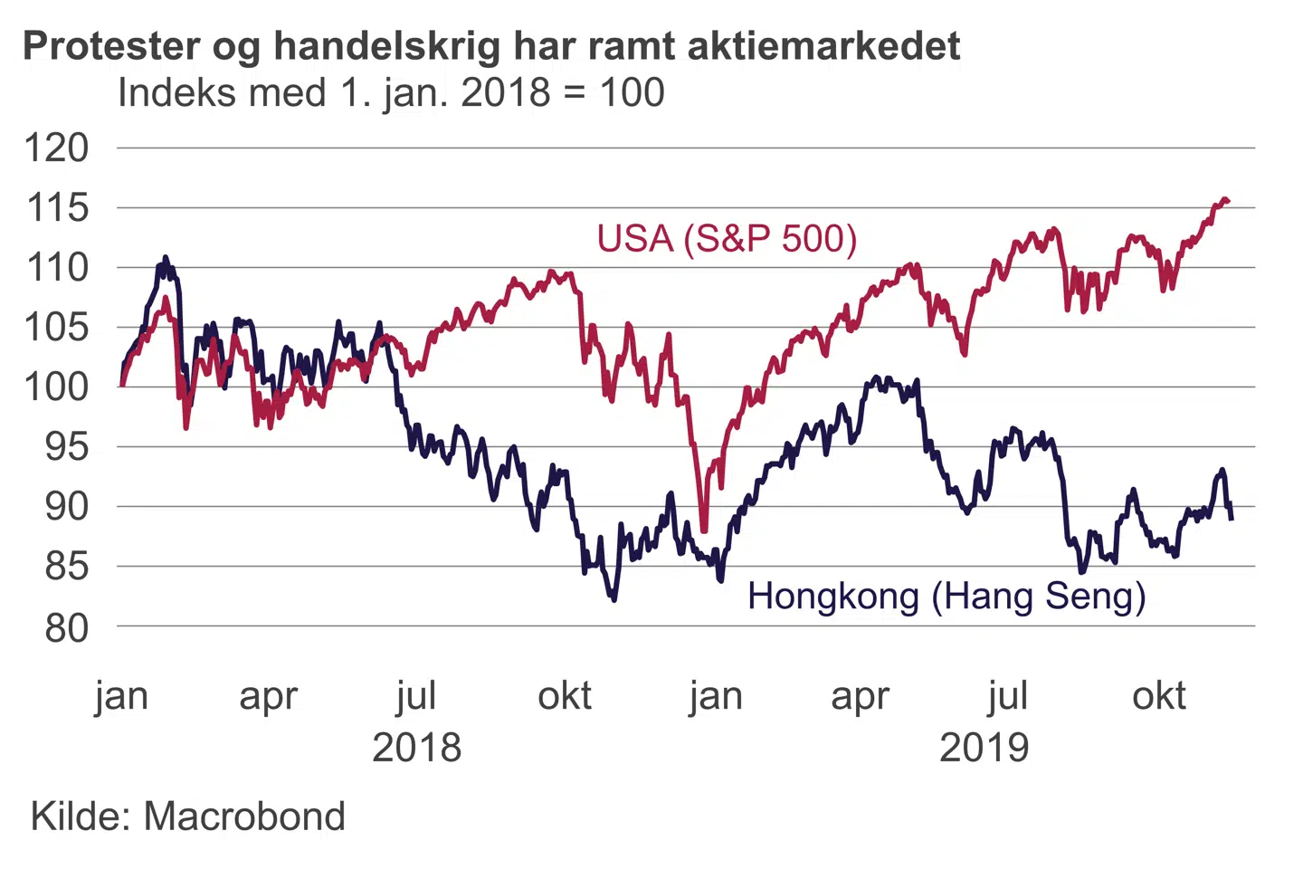 Handelskrigen mellem USA og Kina var allerede en negativ faktor for Hongkongs økonomi, da protesterne brød ud i foråret. En lille åben økonomi med fokus på handel og finans er altid særlig sårbar over for forstyrrelser af handelsmønstre. Men protesterne har tvunget økonomien i knæ.