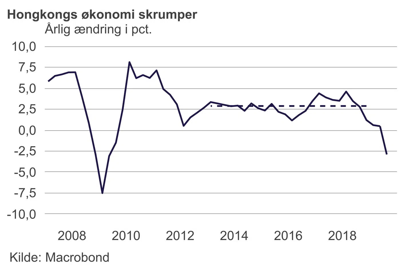 De foreløbige tal for tredje kvartal viser, at den samlede aktivitet er faldet tre pct. i forhold til året før. Det er det største fald siden finanskrisen, og der er intet, der tyder på en snarlig vending. Hongkongs økonomi er ellers vokset stabilt med knap tre procent mellem 2013 og 2018.