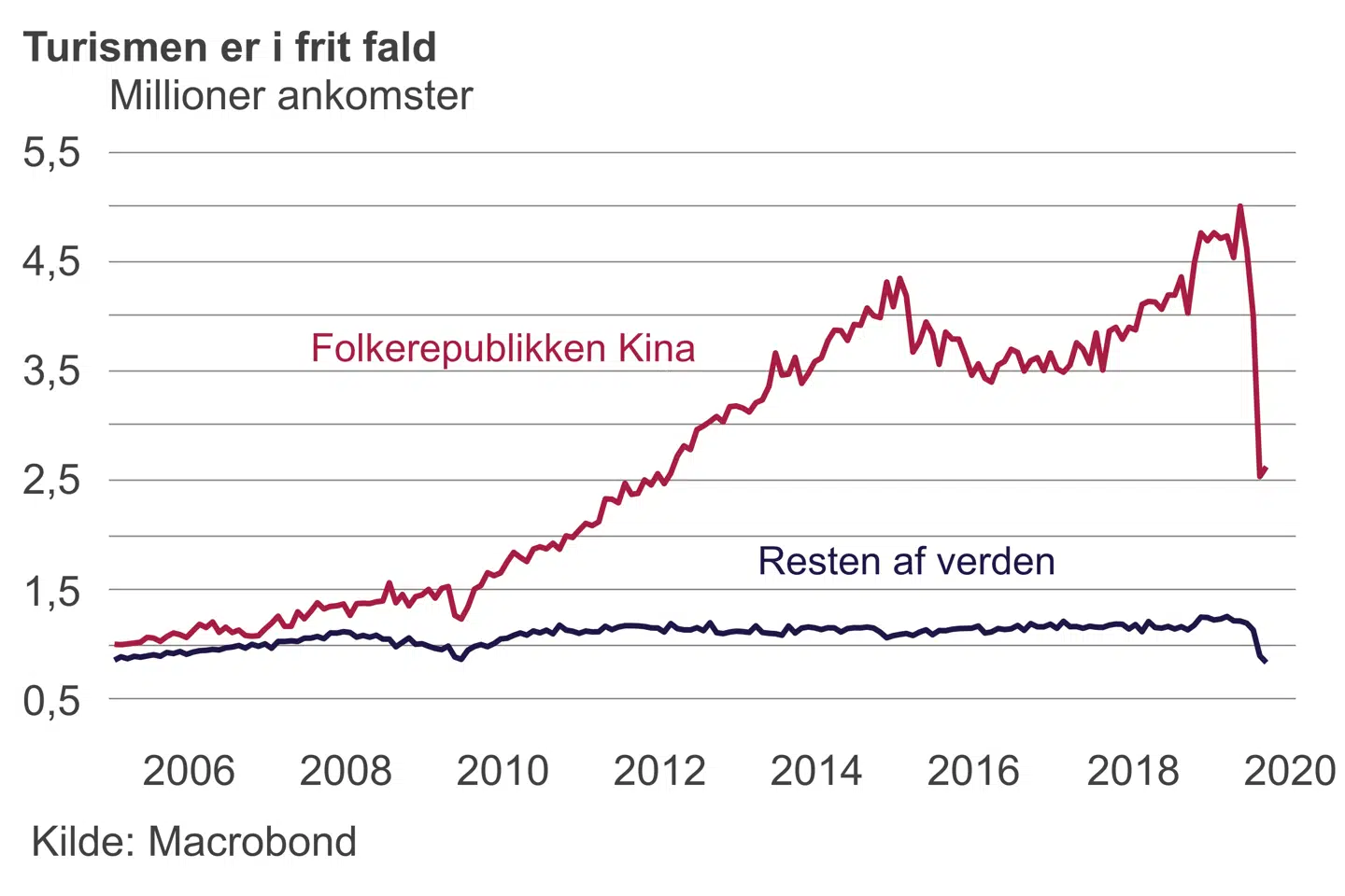 Antallet af turister fra Kina er ellers eksploderet siden finanskrisen i takt med den stigende velstand i den kinesiske middelklasse. Hongkong er blevet en shoppingdestination, hvilket sammensætningen af Hongkongs butikker også afspejler. Siden maj er antallet af kinesiske turister halveret, hvilket blandt andet har lammet markedet for guidede ture. Hvis ikke turiststrømmen fra fastlandet vender, kan store dele af butikslivet bukke under.
