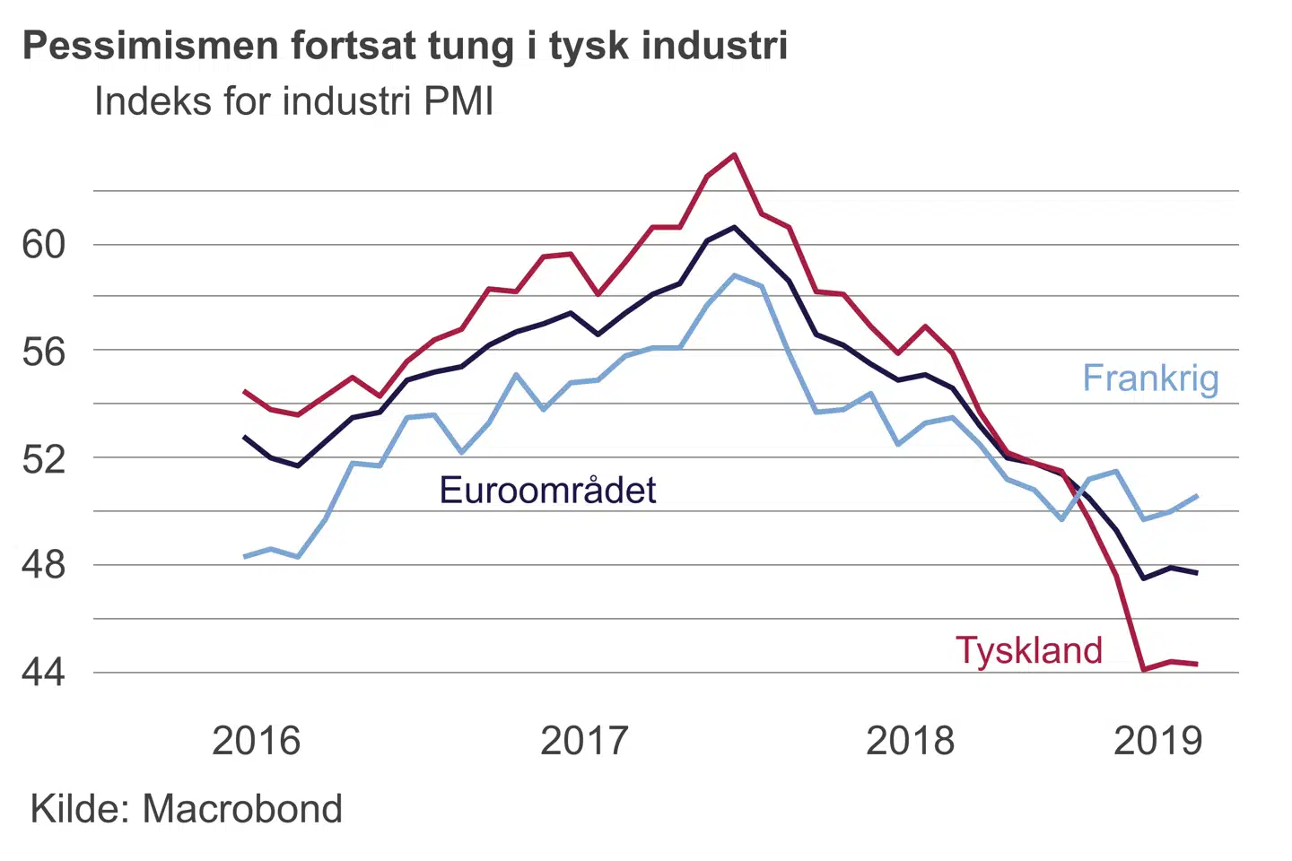 Behovet for andre vækstkilder understreges også af de seneste tal for tysk erhvervstillid. Industrien er fortsat langt nede i kulkælderen, og det overordnede indeks peger på kraftig tilbagegang. Det er i høj grad resultatet af en svagere global økonomi, men også nedbringelse af lagre, der trækker ned i aktiviteten. Virksomhedernes vurdering af færdigproducerede varer er på det højeste niveau siden finanskrisen. Det er noget, der vil trække ned i aktiviteten, også i de kommende måneder.
