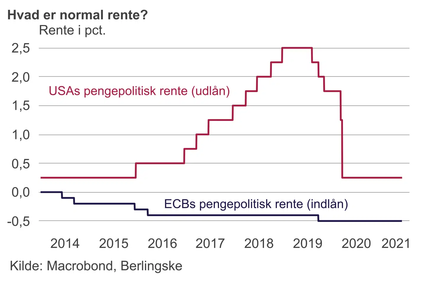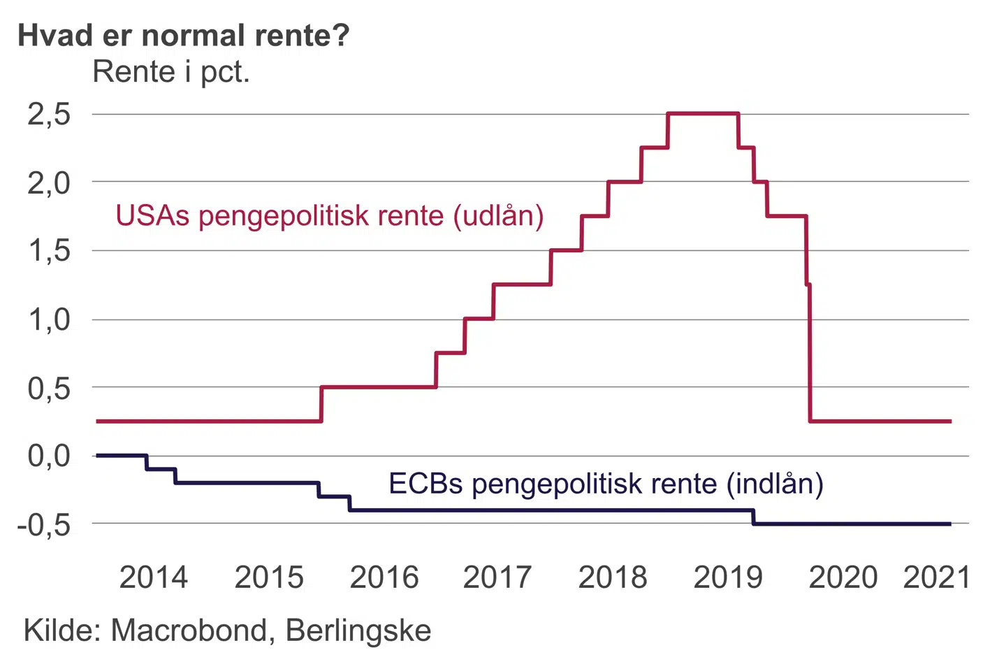 I Europa er man på papiret enig med amerikanerne. Men der er en gigantisk forskel i mavefornemmelsen. Hvis der er udsigt til, at inflationen mere vedvarende kryber bare en smule op, vil ECB være tvunget til at flytte sig væk fra løftet om evige køb af obligationer og ikke mindst de negative renter.