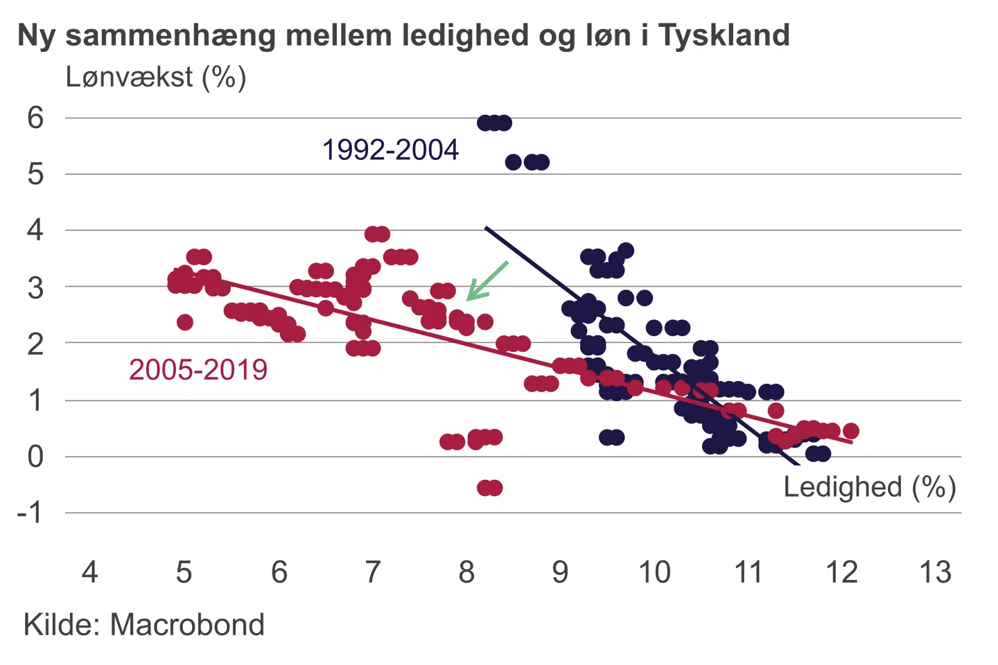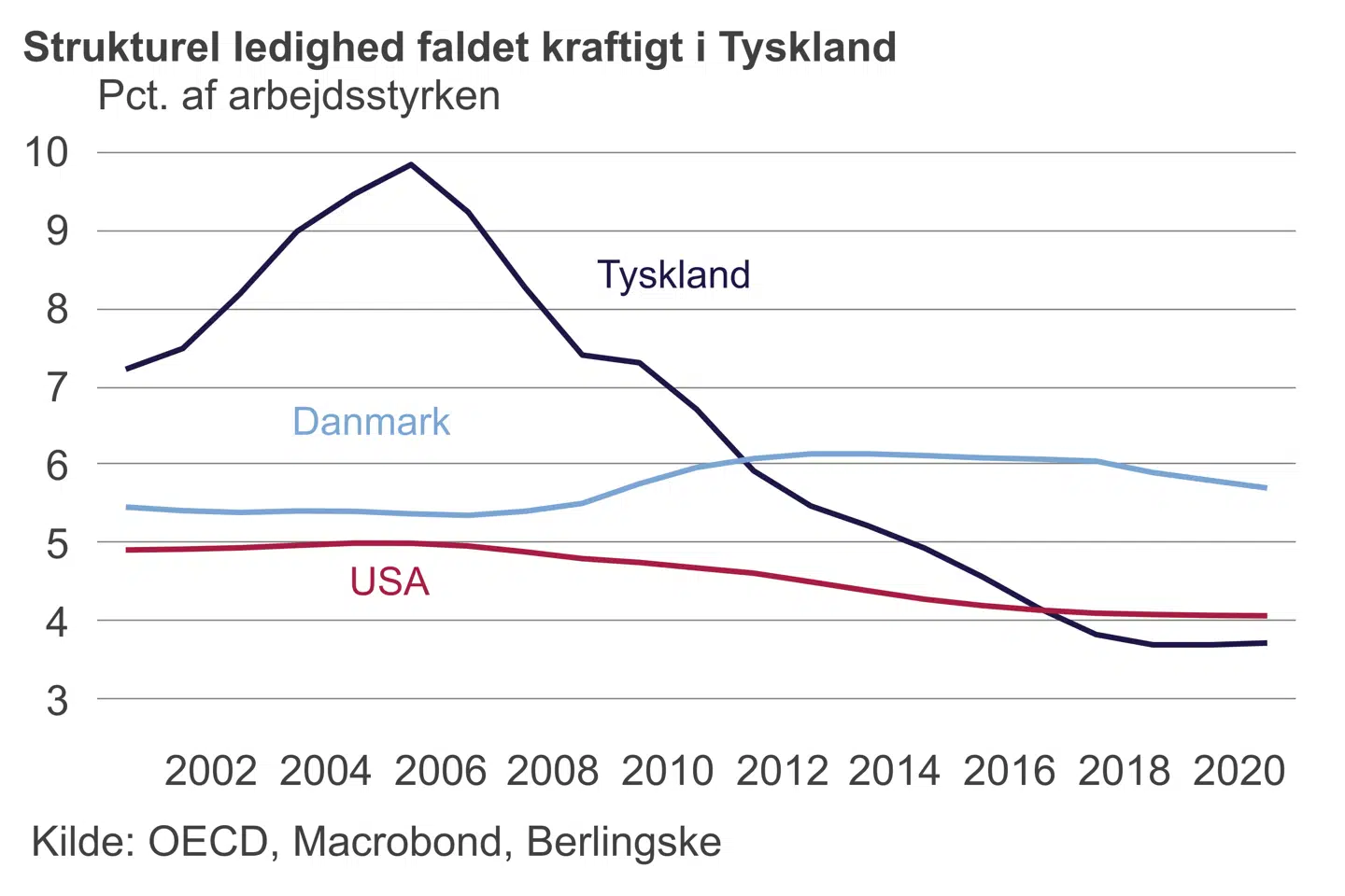 Det samlede resultat har været, at tyske lønninger slet ikke er steget på den måde, som de plejede i perioder med faldende ledighed. Det betyder, at den såkaldte strukturelle eller naturlige ledighed, hvor der opstår løninflation, er faldet og faldet. OECD har beregnet, at den naturlige ledighed i Tyskland er faldet fra ti til fire procent siden 2005. Det er langt mere, end vi har oplevet herhjemme.