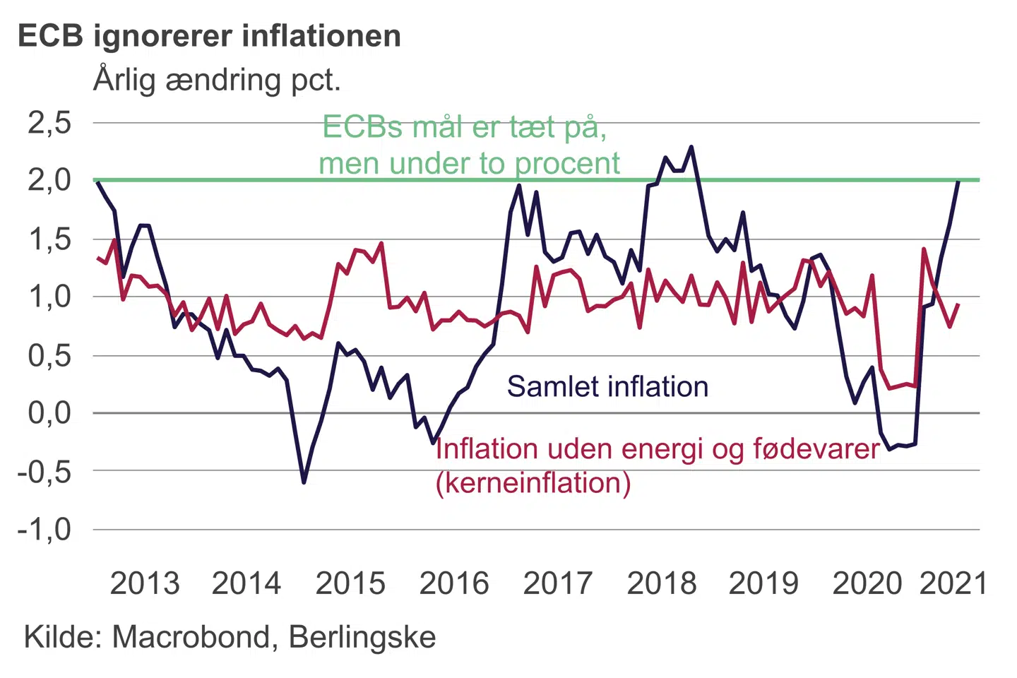 Dermed kan ECB fortsætte med at ignorere, at inflationen i de kommende måneder vil ligge langt over ECBs målsætning om »tæt på, men under to procent«.