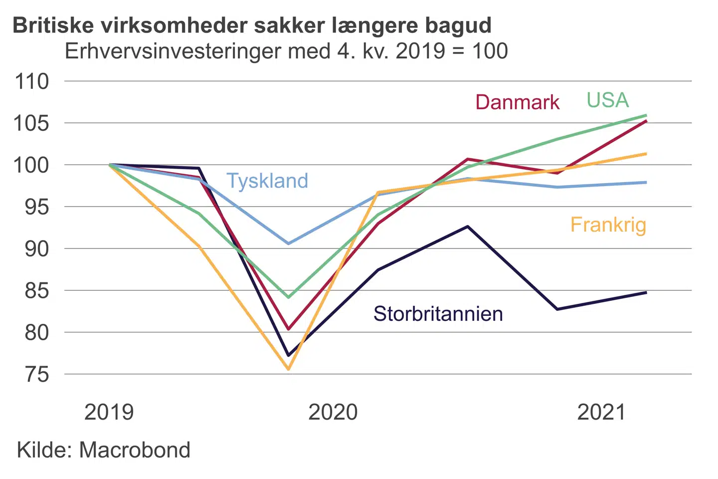 Det har sat sig spor i britisk økonomi, hvor aktiviteten næsten ikke voksede i august og dermed har stabiliseret sig under 2,5 procent under niveauet ved udgangen af 2019. Det er dog ikke kun de fortsatte begrænsninger, der trækker ned og risikerer at give britisk økonomi et træls efterår. Den globale forsyningssituation rammer også britiske virksomheder, akkurat som herhjemme, men langt mere alvorligt er en akut mangel på arbejdskraft.