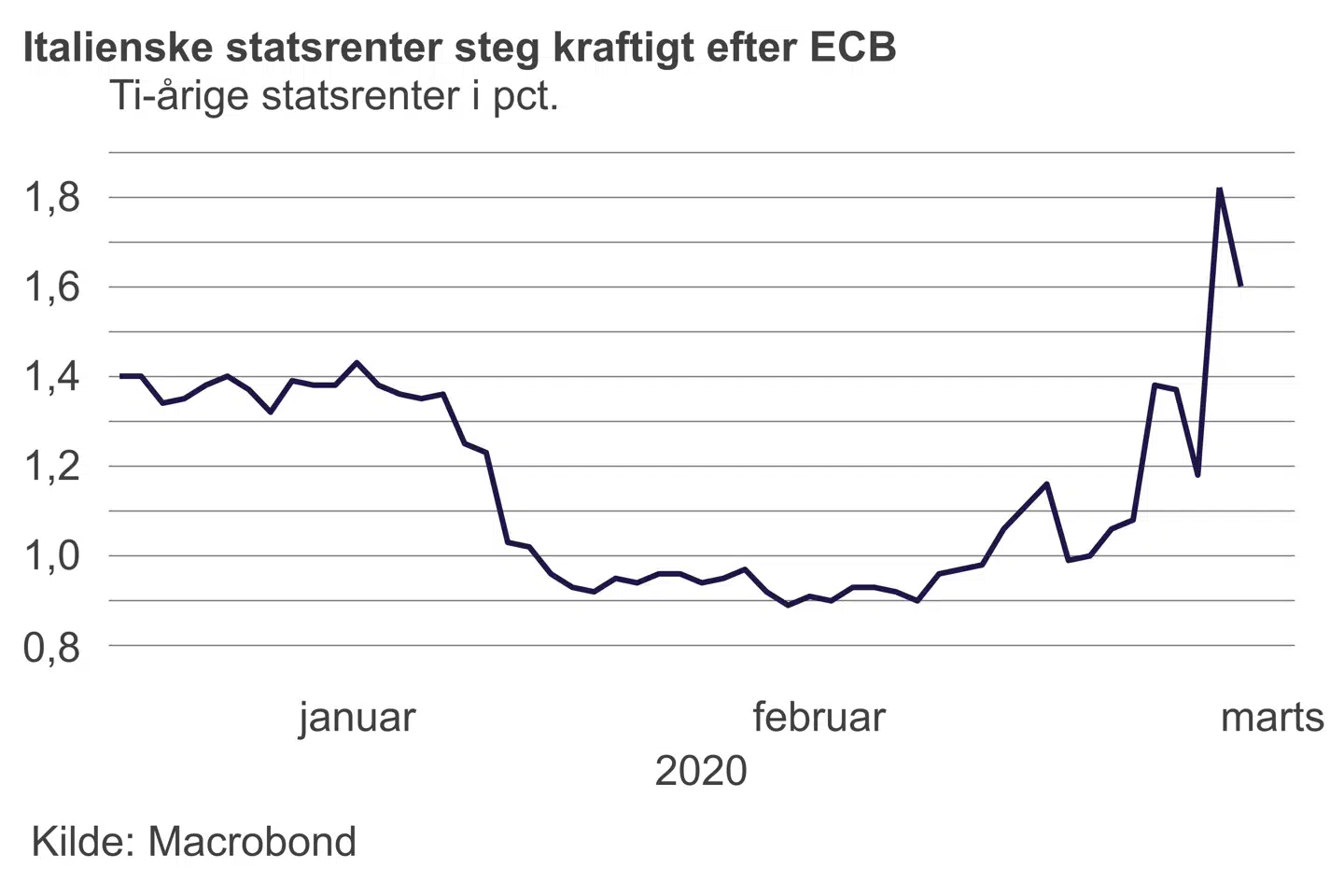 Men ECB leverede ikke på torsdagens møde. Der kom en begavet plan for at støtte bankerne og ikke mindst små og mellemstore virksomheder, der også vil gavne Italien. Og måske især Italien, hvor erhvervslivet er domineret af mindre virksomheder. Men der var ingen særskilt hjælp til den italienske stat. Og for at gøre ondt værre sagde Lagarde, at det ikke var ECBs opgave at »holde rentespændet nede«. Altså, at det ikke er ECBs opgave at forhindre italienske renter i at stige. Hvilket så var præcis, hvad de gjorde.