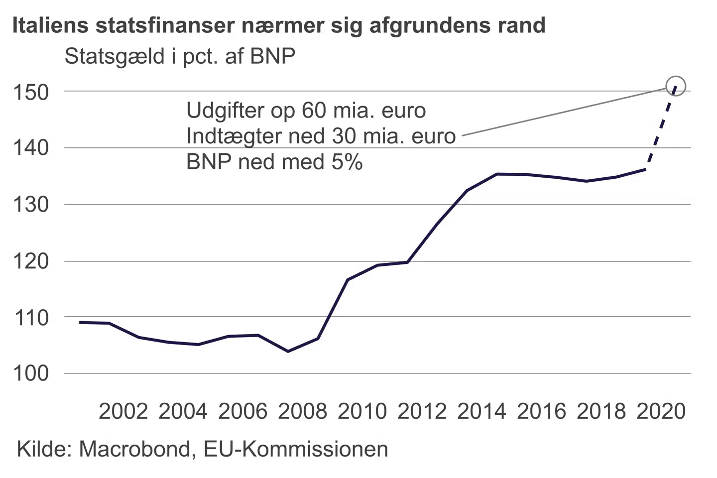 Et simpelt regnestykke viser udfordringen. Antag, at den økonomiske aktivitet falder med fem procent i år, som den gjorde i 2009. Læg dertil mere stimulans og en lang række andre udgifter for staten til at inddæmme og bekæmpe virussen. Og et stort fald i statens indtægter som følge af faldet i den indenlandske aktivitet. Så kommer underskuddet på de offentlige finanser i år op på seks procent af BNP. Men det betyder også, at gælden hopper til i nærheden af 150 pct. af BNP. Dermed rykker Italien tættere på Grækenland og endnu længere væk fra de øvrige eurolande.