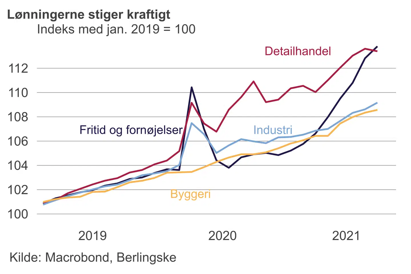 »Det er tydeligt, at der er et markant opadrettet pres på lønningerne i USA. I fritid og fornøjelser samt detailhandlen ligger lønningerne nu 13 procent højere end i begyndelsen af 2019. I industrien og byggeriet er lønningerne otte til ni procent højere. Der er altså et ganske markant lønpres, hvilket øger risikoen for en mere langstrakt periode med høj inflation. Derfor kan den første renteforhøjelse i USA sagtens komme tidligere end foråret 2023, der lige nu er centralbankens eget sigtepunkt,« siger Ulrik Harald Bie og tilføjer: