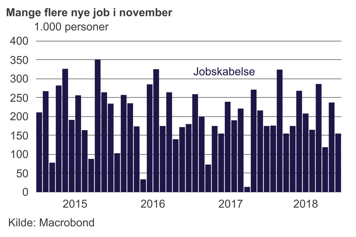 Den amerikanske jobskabelse i november skuffede lidt i forhold til markedsforventningerne. Der blev skabt 155.000 nye job, hvilket er betydeligt under gennemsnittet for året på 206.000 og niveauet i oktober på 246.000. Beskæftigelsen i industrien fastholdt de flotte takter fra de forrige måneder, mens byggebeskæftigelsen havde en lidt svag måned. Jobvæksten i servicesektoren blev især trukket ned af restaurations- og underholdningssektoren, der har haft store udsving de seneste måneder som følge af orkaner. Arbejdsløsheden forblev på 3,7 pct. og fastholder dermed det laveste niveau siden 1969.
