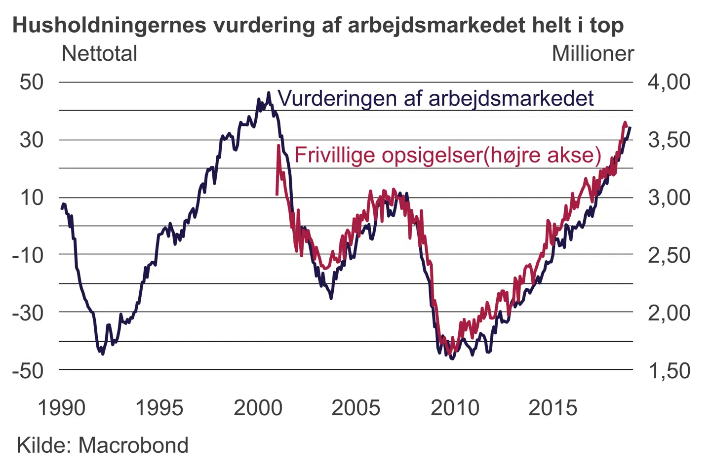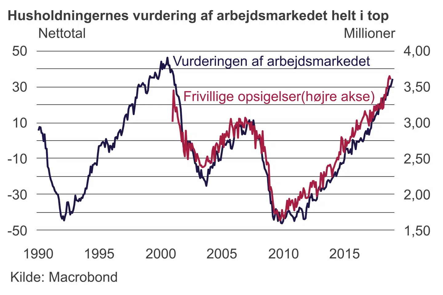 Samtidig har antallet af ansatte, der frivilligt forlader sit job (som regel for at søge et andet), nu passeret den hidtidige top i 2000. Netop denne komponent har tidligere spillet en vigtig rolle for centralbanken i vurderingen af arbejdsmarked og lønpres: hvis ansatte er villige til at søge nye job er det tegn på, at der er job at få. Husholdningernes vurdering af arbejdsmarkedet er steget tilsvarende.