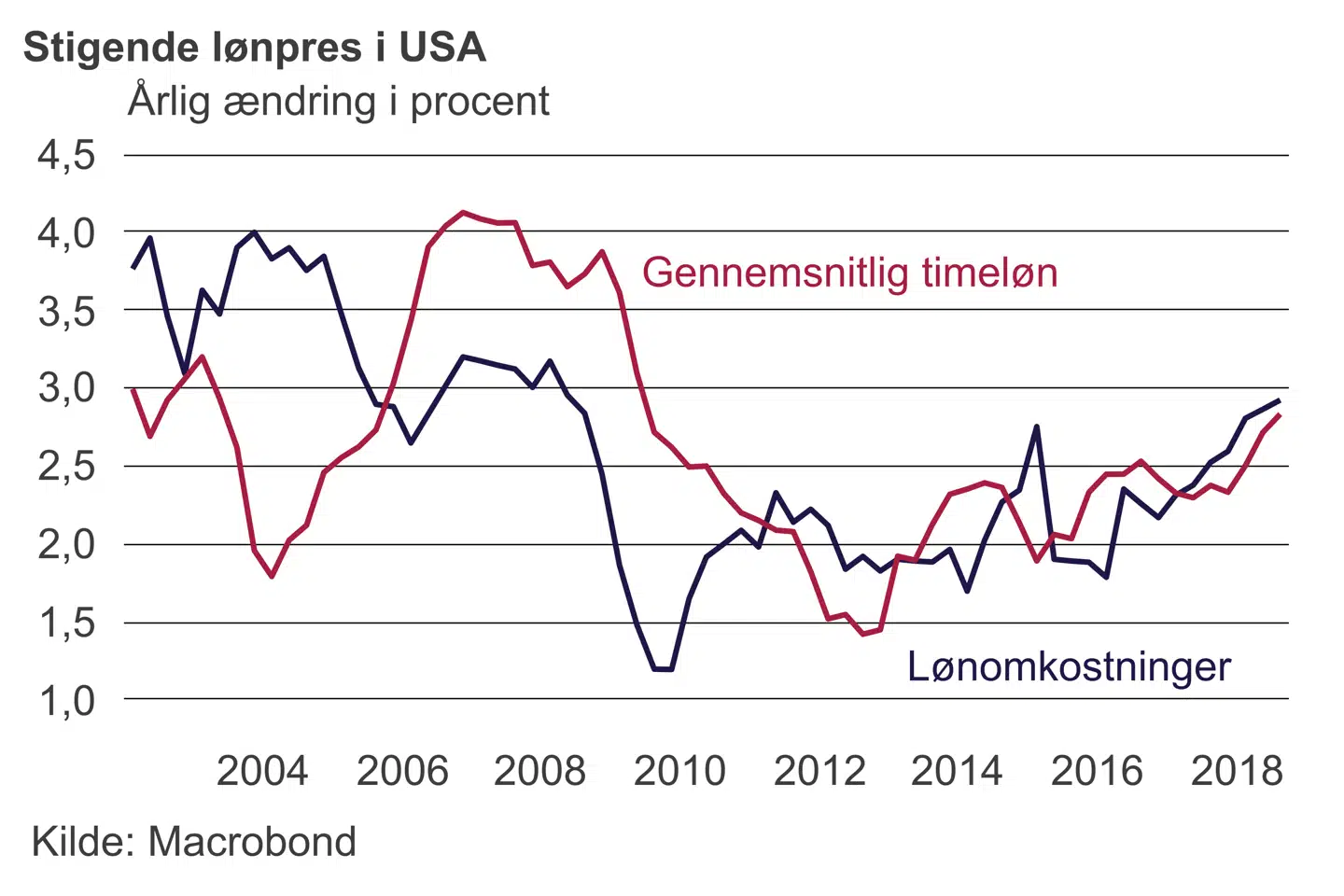 Det betyder også, at arbejdsgiverne bliver nødt til at betale højere løn, hvis de skal fastholde og tiltrække arbejdskraft. Stigende lønpres belaster virksomhedernes regnskaber, men er centralt i præsident Trumps økonomiske fortælling om, at skattelettelser til virksomheder og de rigeste vil gavne middelklassen gennem bedre lønnede job. Det øger også incitamenterne til at forøge investeringerne i teknologi og produktionsudstyr.
