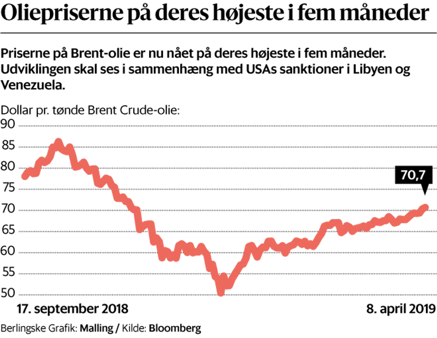 Ifølge råvareanalytikere skyldes stigningen en række geopolitiske hændelser og situationer i olieproducerende lande, der alle bidrager til den store prisvækst. Således har USAs sanktioner mod Venezuela og Iran gødet jorden for, at nordsøolien stiger i pris. Men endnu vigtigere er den blodige borgerkrig i Libyen, hvor oprørere har indtaget flere oliefelter og reservoirer i deres kamp.