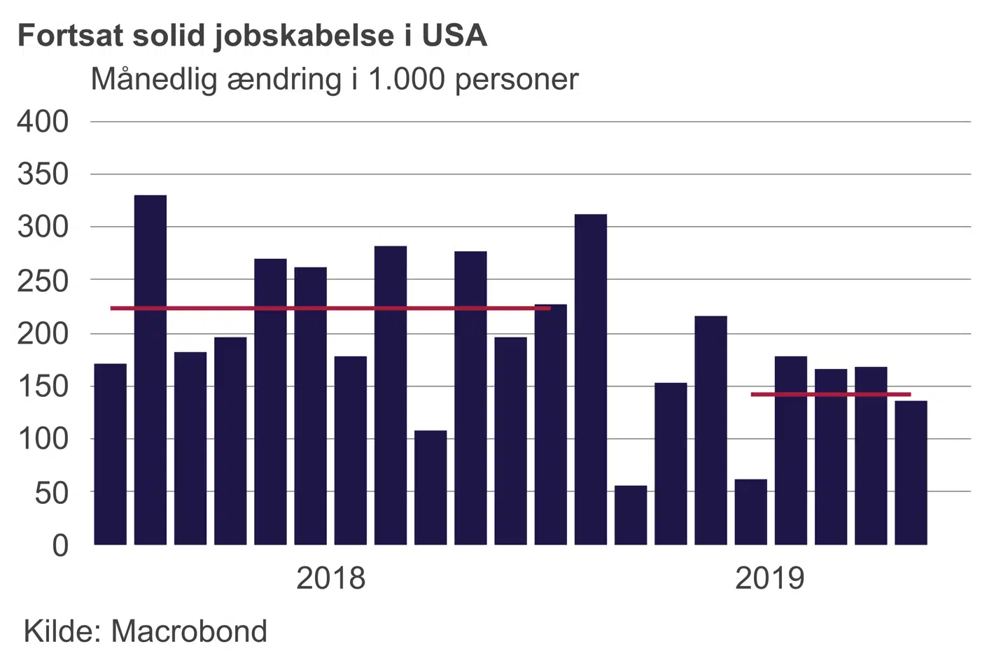 Men jobmarkedet understreger også den ændrede vækstdynamik i økonomien: Beskæftigelsen i det offentlige og den private servicesektor steg pænt, mens byggeri og industri ikke bidrog. Arbejdsløsheden faldt samtidig til det laveste niveau i 50 år. Lønvæksten aftog en anelse fra 3,2 pct. til 2,9 pct., men det er fortsat nok til at sikre en pæn fremgang i reallønnen.