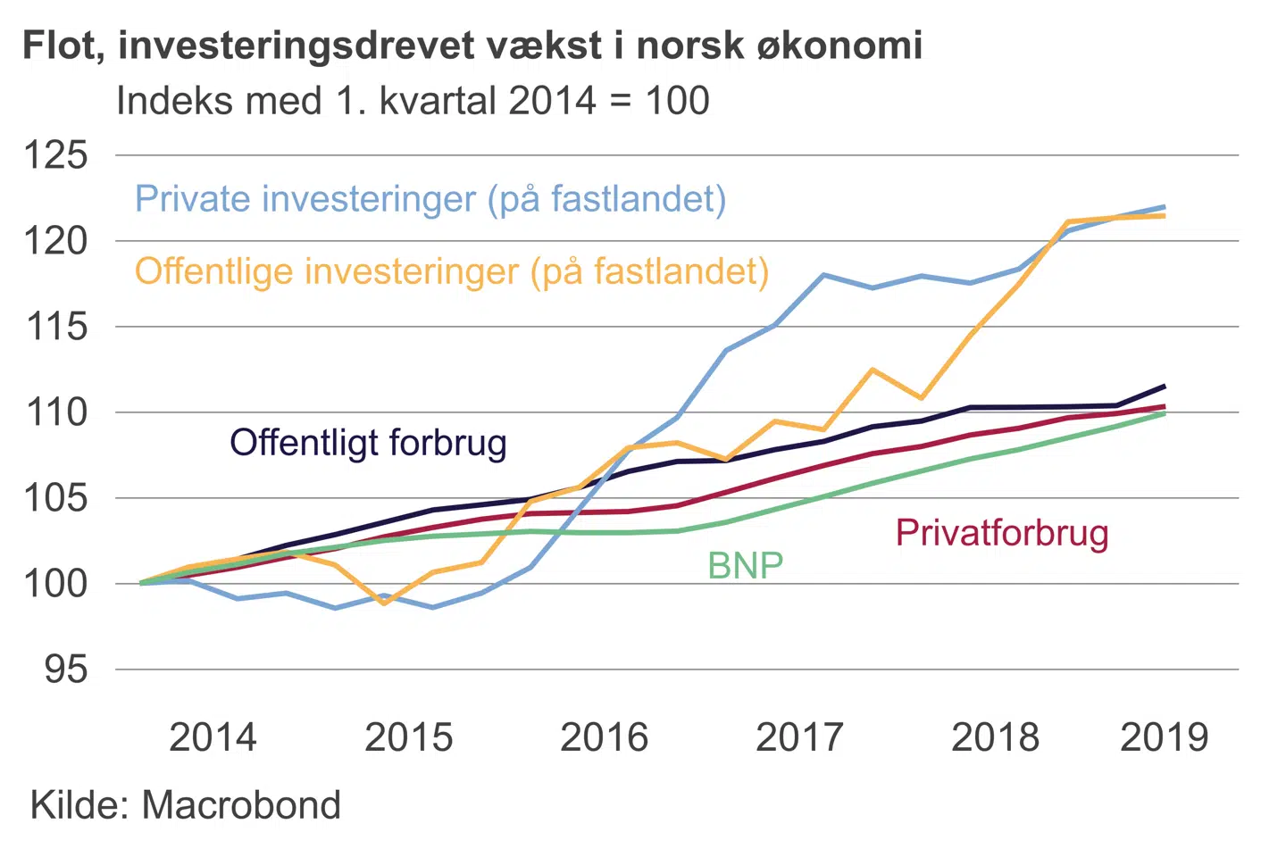 Det interessante er, at det i mindre grad end tidligere er privatforbruget, der en vækstdynamoen i fastlandsøkonomien, men snarere private og offentlige investeringer. Begge poster er steget over 20 pct. siden begyndelsen af 2014. Det skyldes paradoksalt nok, at olieindustrien har haft det svært med et stort fald i investeringsomfanget. Dermed er både mandskab og ressourcer blevet tilgængelige for andre områder. Blandt de offentlige investeringer er vejinfrastruktur en af de store poster. Nu er olieinvesteringer igen på vej op, og beskæftigelsen i Norge er steget med 50.000 det seneste år. Lønstigningstakten er også tiltagende og lå på 2,8 pct. sidste år.