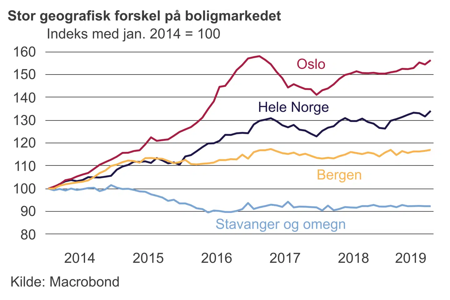 Det seneste års renteforhøjelser er også en reaktion på en periode med kraftig vækst i husholdningernes gældsætning. Derfor har Norges Bank - ligesom herhjemme - også presset på for at hæve de kapitalreserver, som bankerne ikke kan belåne, den såkaldte kontracyckliske buffer. På trods af en afmatning i stigningstakten i både boligpriser og husholdningernes gæld er Norges Bank fortsat bekymrede for niveauerne. Siden begyndelsen af 2014 er boligpriserne på landplan steget med 34 pct.; i hovedstanden Oslo er prisstigningen på hele 56 pct., mens boligpriserne er faldet med ti pct. i oliehovedstaden Stavanger.