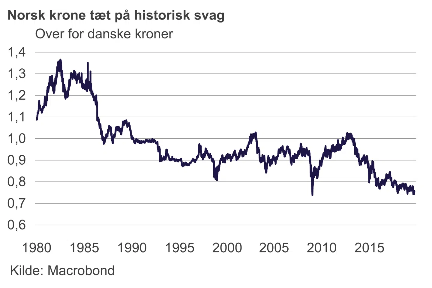 Renteforhøjelserne har dog ikke smittet af på den norske krone, og på trods af en svag stigning over for danske kroner efter renteudmeldingen er norske kroner tæt på det svageste nogensinde: én norsk krone koster omkring 0,75 danske kroner.