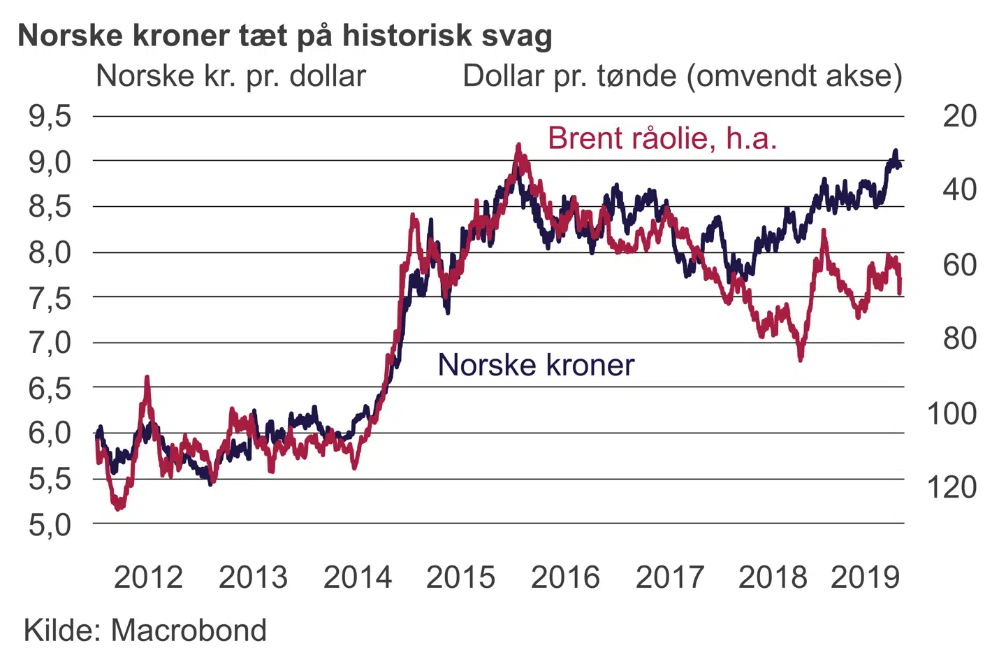 Den svage norske krone står også i kontrast til udviklingen i olieprisen, som ellers historisk har været en god indikator for valutaudviklingen i Norge. Hvis man ser på sammenhængen mellem 2012 og 2017, ville man med den nuværende kronekurs forvente, at olieprisen lå på omkring 30 dollar pr. tønde. Det er under halvdelen af den faktiske pris.