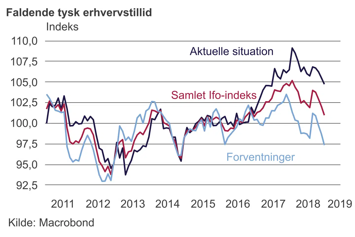 Der var fald i vurderingen af den nuværende situation, men især forventningerne til fremtiden har taget et dyk. Forventningsindekset er på det laveste niveau siden februar 2016, da tysk industri var ramt af en vækstafmatning i de nye vækstøkonomier.