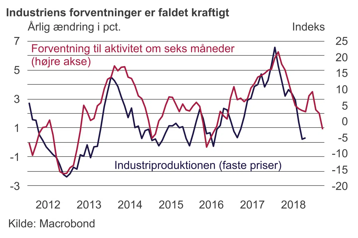 Industrivirksomhederne forventer nu samlet set en faldende omsætning de kommende seks måneder for første gang siden maj 2016. Problemerne i bilindustrien er helt centralt i de tyske udfordringer – både direkte og de mange underleverandører, der er påvirket af den faldende omsætning og efterveerne fra dieselskandalen og en langsom omstilling til nye udledningskrav. Industriproduktionen har vist en faldende tendens de seneste måneder og er nu slet ikke vokset det seneste år. Eksporten er ikke overraskende tilsvarende svag.