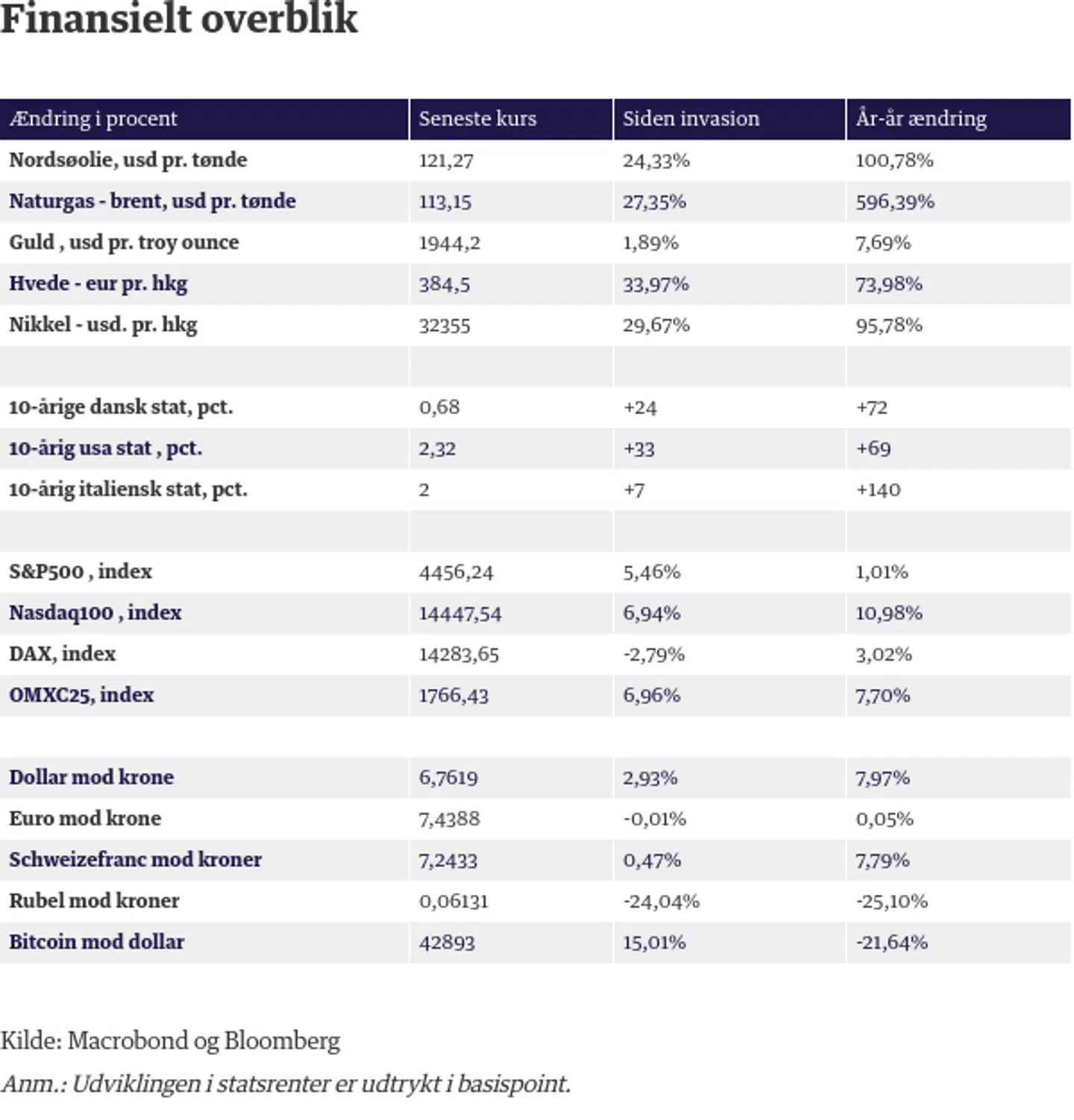 24. februar invaderede Rusland nabolandet Ukraine. Nu, præcis en måned senere, har dette sat betydelige aftryk i prisen på råvarer, obligationer, i aktieindeks og valutakurser. Berlingske giver dig her et overblik over de seneste tal og en forklaring på, hvad der har gjort udfaldet.