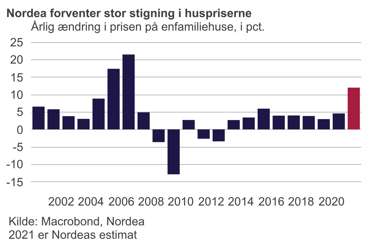 »Det skyldes, at prognosen er baseret på de gennemsnitlige salgspriser for hele året, og da priserne navnlig er steget mod slutningen af 2020 og ind i begyndelsen af 2021, vil det i sig selv give et stort løft til årsstigningstakten for hele 2021,« skriver Nordea i den nye prognose.