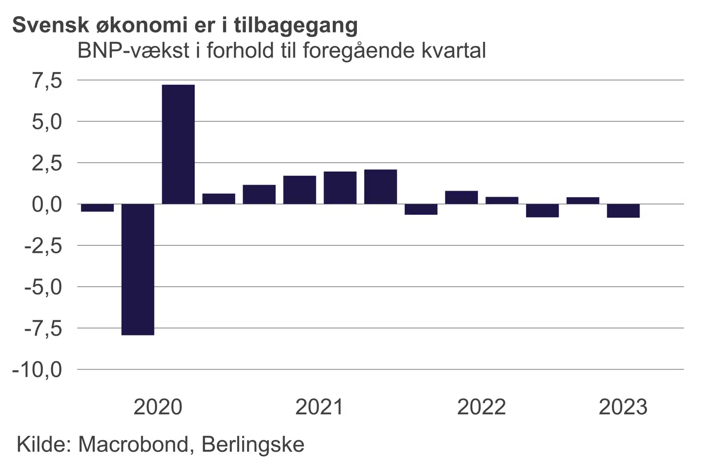 Nedturen i svensk økonomi er nu endnu mere konkret. Den svenske økonomi tog et ordentligt dyk i de seneste tre måneder, hvor der blev kappet 0,8 procent af svenskernes velstand målt ved bruttonationalproduktet, BNP.
