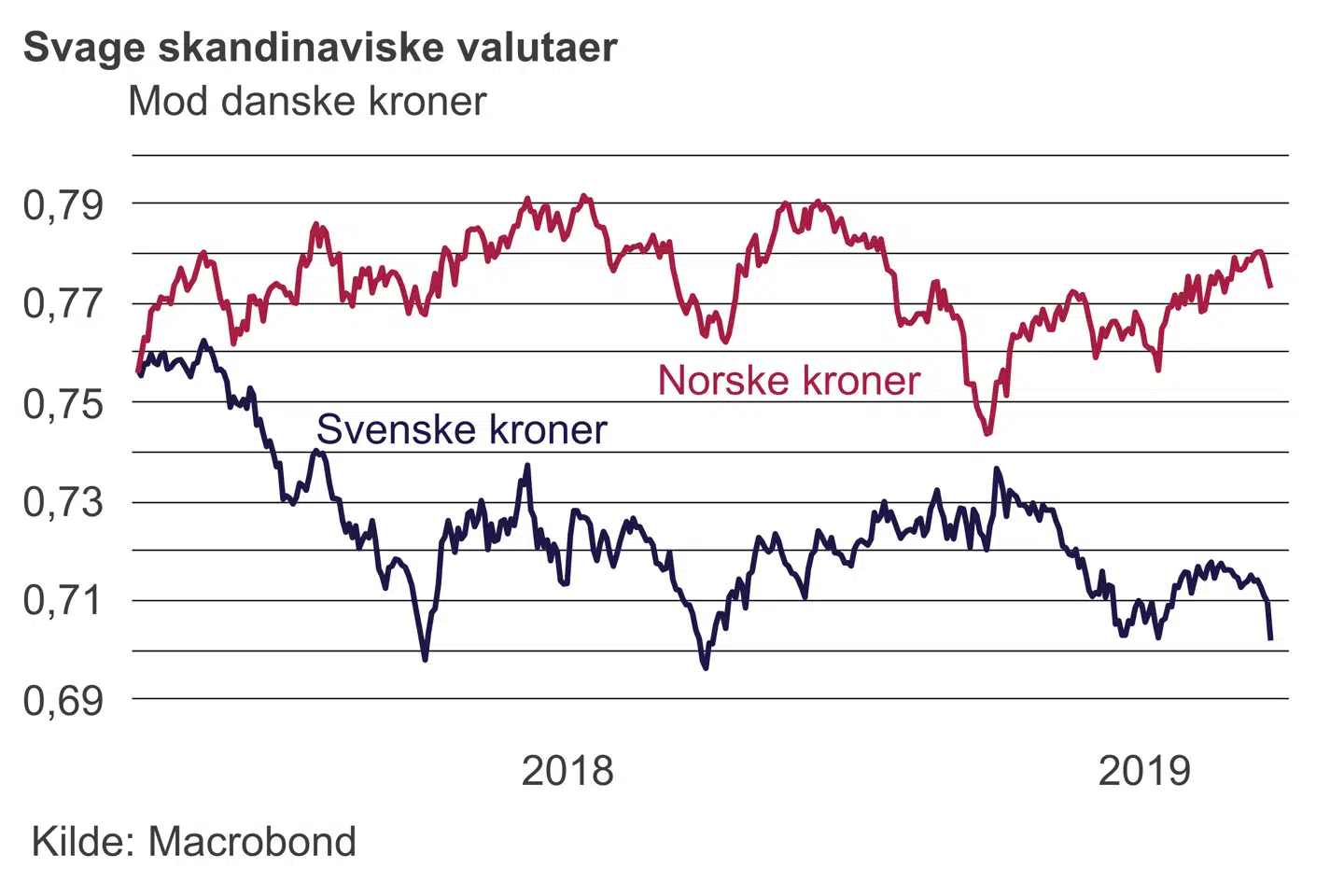 I skrivende stund er den svenske krone svækket med 1,3 procent over for euroen og dermed den danske krone til 0,70 danske pr. svensk. Dermed er den svenske krone tilbage på det svageste niveau siden sommeren 2018. Den norske krone blev også en smule svækket efter Riksbankens annoncering; de to skandinaviske valutaer ses i valutamarkedet ofte i forhold til hinanden.