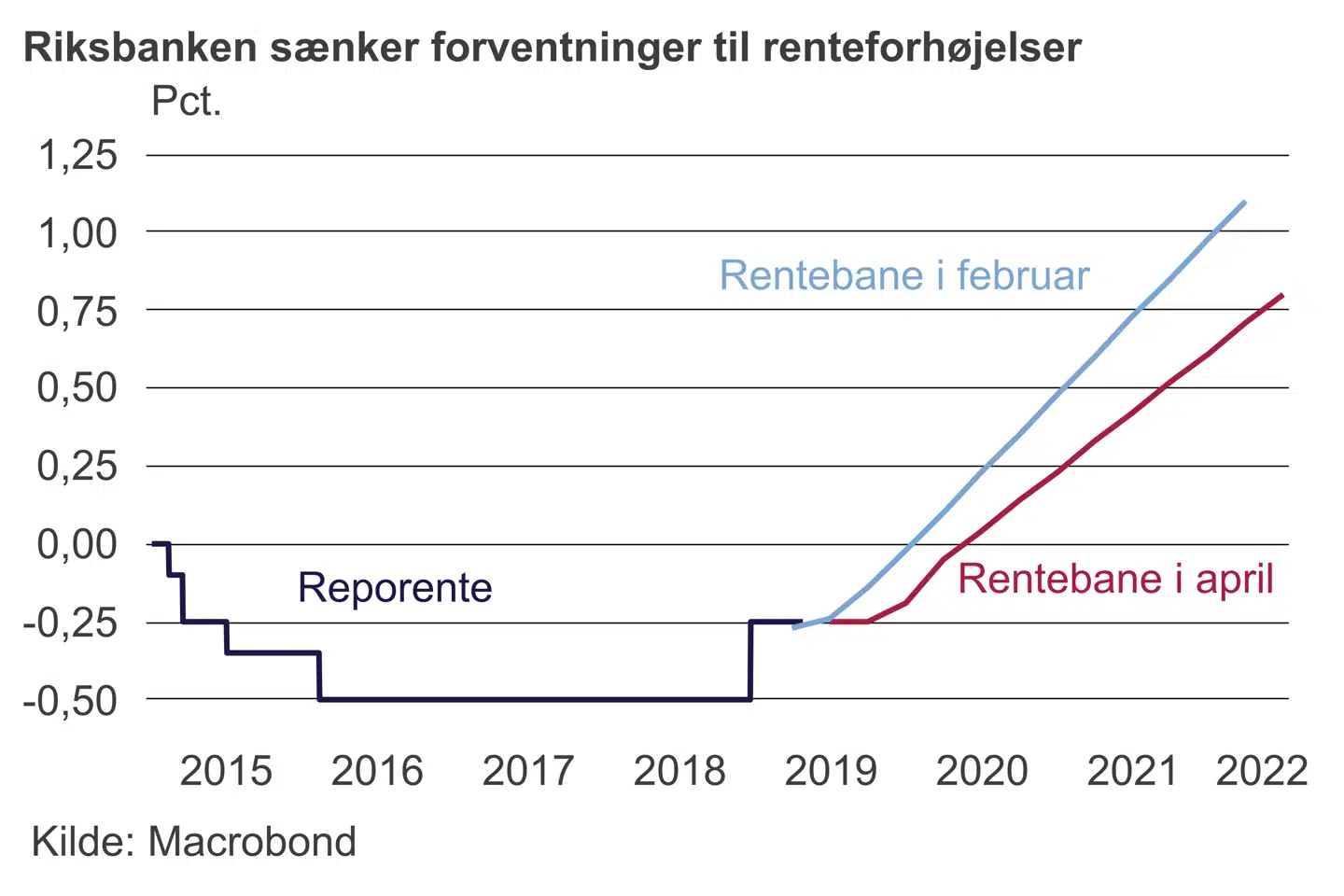 Der var ikke noget overraskende i Riksbankens beslutning. Riksbanken hævede renten til -0,25 pct. i december og fastholdt ved mødet i februar forventningen om flere renteforhøjelser i år. Det var allerede på det tidspunkt ikke særlig sandsynligt. Siden har Den Europæiske Centralbank ved sit pengepolitiske møde i marts udskudt renteforhøjelser til tidligst 2020.