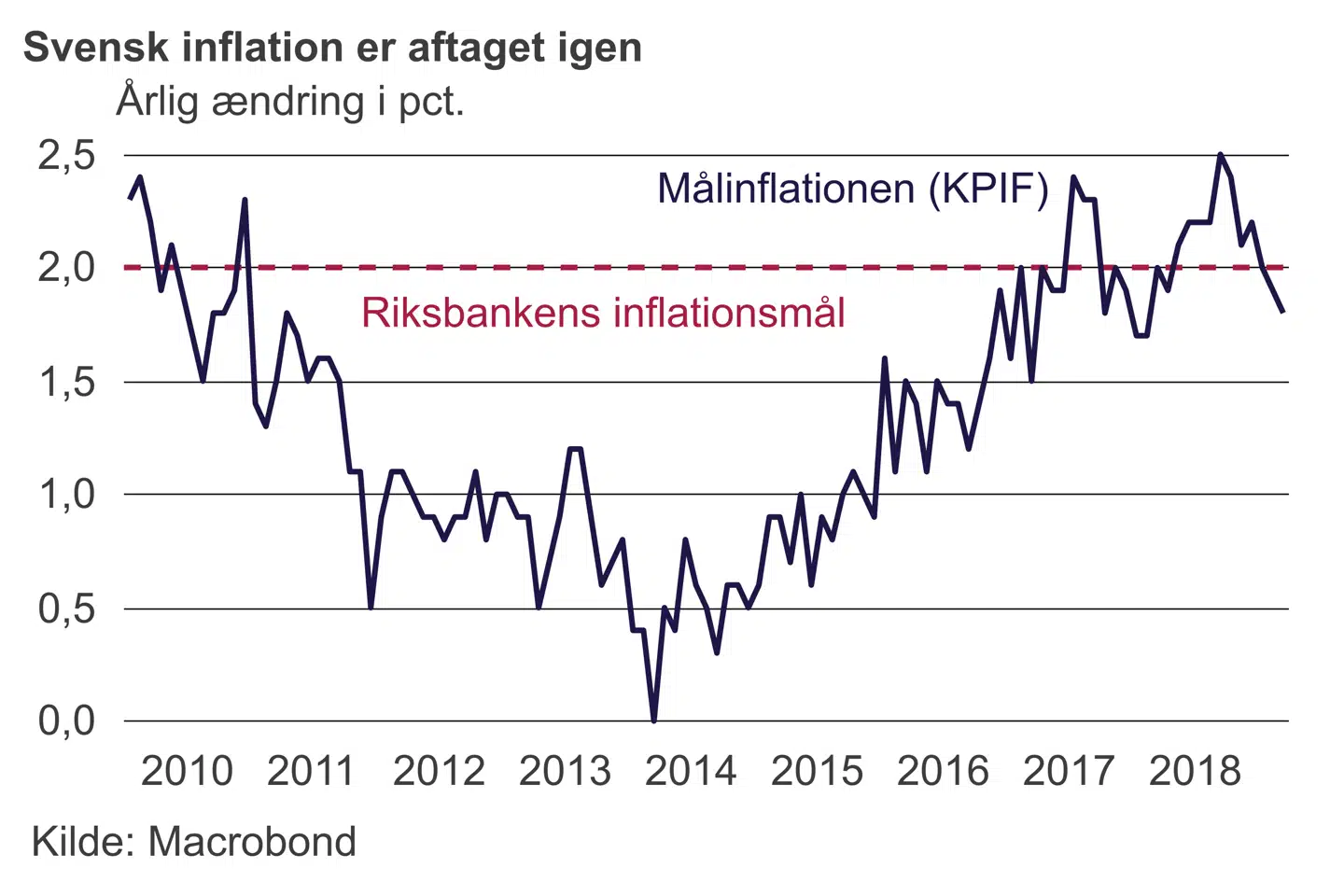 På trods af fortsat vækst er svensk inflation igen aftagende og lavere end Riksbanken havde forventet. Det er figenbladet for at holde foden på speederen. Inflationen har været aftagende de seneste måneder på trods af stigende energipriser. Sverige er et af de bedste eksempler på, at der er en ny sammenhæng i forhold til tidligere mellem arbejdsmarked og inflation. Riksbanken har ikke opfyldt sin inflationsmålsætning over en længere periode siden indførelsen i 1993. En fortsat meget lempelig pengepolitik risikerer at yderligere forøge gældsætningen i husholdningerne og puster til boligpriserne. Det er absolut ikke, hvad Sverige har brug for på nuværende tidspunkt.