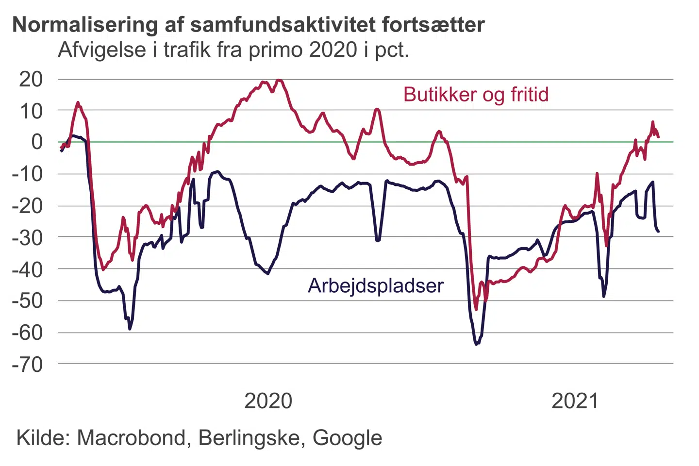 Et yderligere element i den manglende genåbningsbegejstring er naturligvis, at mange fortsat arbejder en del hjemme, og derfor ikke kommer ud lige så meget som normalt. Trafikken til arbejdspladserne er løbende steget siden begyndelsen af året og ligger nu omkring 20 procent lavere end normalt. Selvom genåbningsplanen foreskriver en meget langsom tilbagevenden til arbejdspladserne, tyder Googles tal dog på, at der har fundet en mere markant normalisering sted.