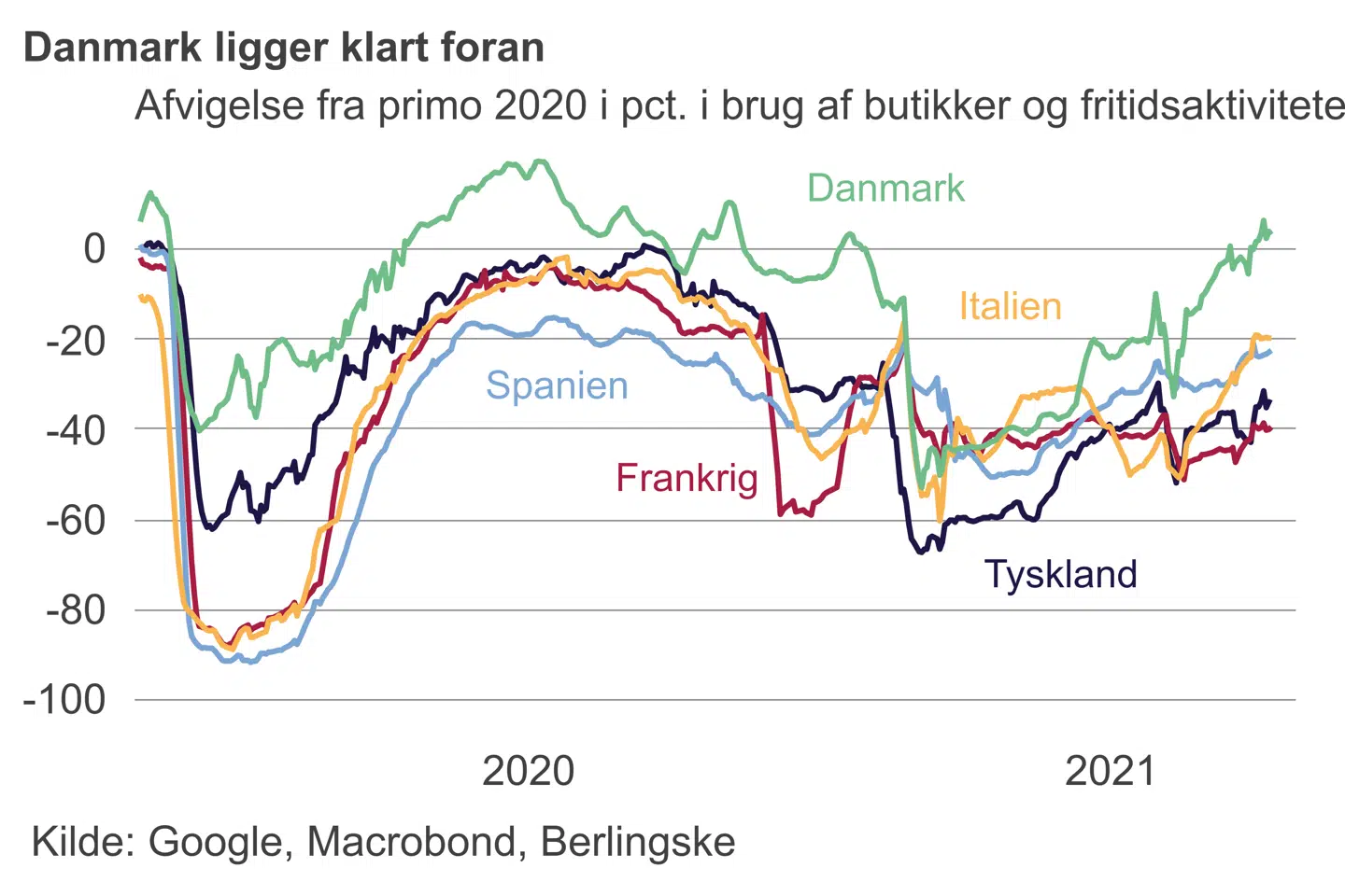 Tyskland er også i gang med en løbende genåbning. Her vaccinerer man med arme og ben og nærmer sig 40 procent af befolkningen, der har fået første stik. Fodtrafikken ligger dog ifølge Googles tal fortsat 30 procent lavere end normalt.