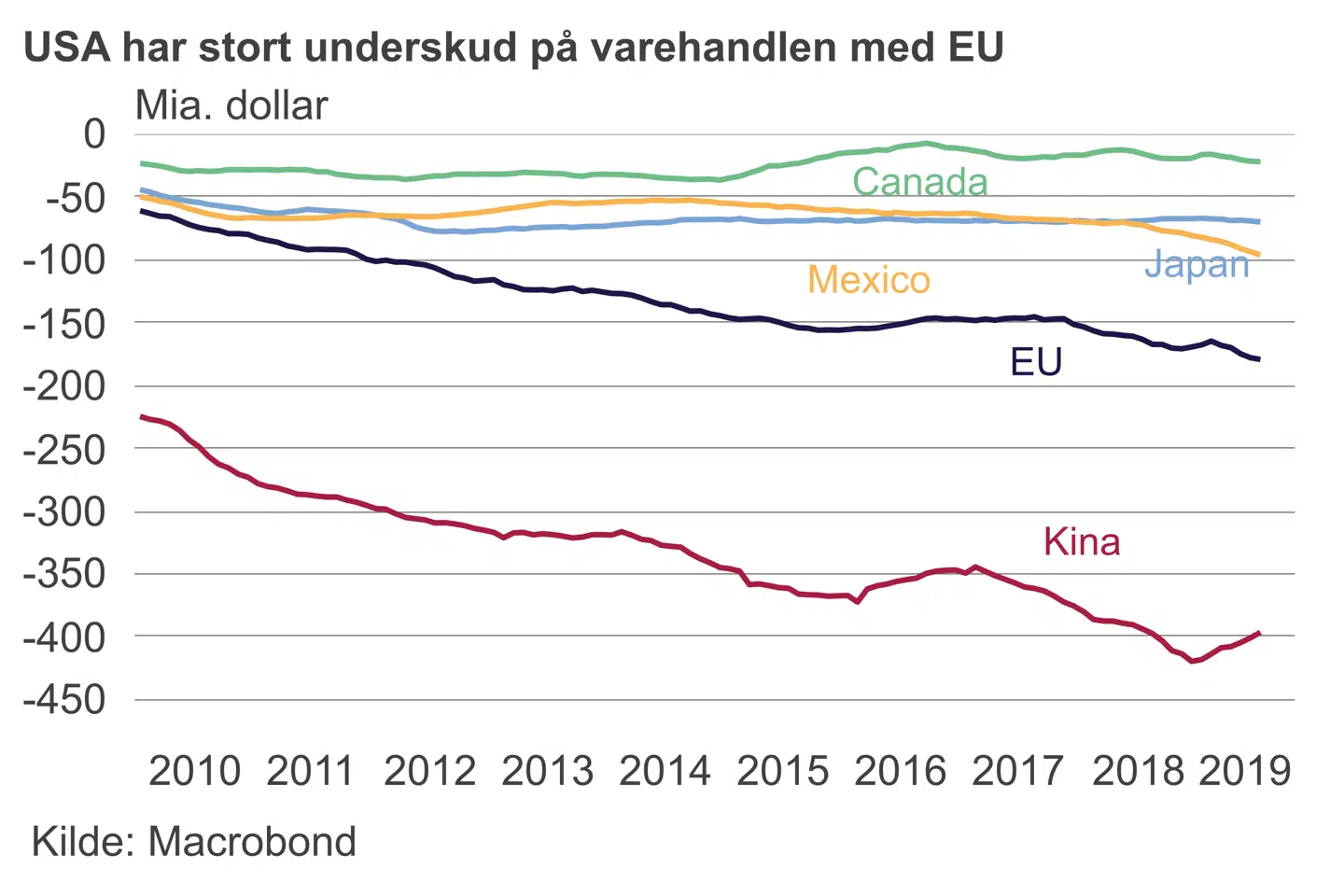 Forude venter også en mulig optrapning af handelskrigen med inddragelse af den europæiske bileksport. Præsident Trump instruerede i maj sine handelsforhandlere om at finde en aftale med EU om en »frivillig« begrænsning af europæisk bileksport. Det vil EU ikke, og Trump har truet med endnu mere straftold. Dette vil ske uden for WTOs regler med henvisning til amerikansk national sikkerhed og åbner dermed for den samme gradvise optrapning, som er set i handelskrigen mellem USA og Kina. USA og EU har allerede taget første runde om »national sikkerhed«, da Trump sidste år indførte straftold på stål og aluminium.