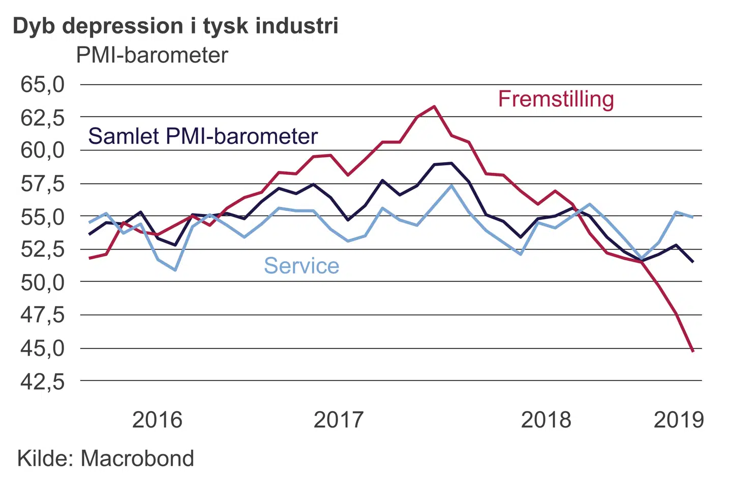 For et år siden var der boblende optimisme i tysk industri. Dagens tillidsbarometer viser dyb depression. Det tyske PMI (Purchase Managers' Index) fra Markit viste et stort fald yderligere ned i området, der indikerer økonomisk tilbagegang. Der var ingen lyspunkter at spore i dagens rapport, hvor tilbagegangen i høj grad blev drevet af et yderligere fald i ordreindgangen. Vurderingen af nye eksportordrer er nu faldet syv måneder i træk, og faktisk er hastigheden i afmatningen tiltaget de seneste måneder. En del skyldes usikkerheden fra Brexit, men tysk industri har også oplevet faldende ordrer fra lande uden for EU; Storbritannien er - trods alt - fortsat en del af EU-familien.