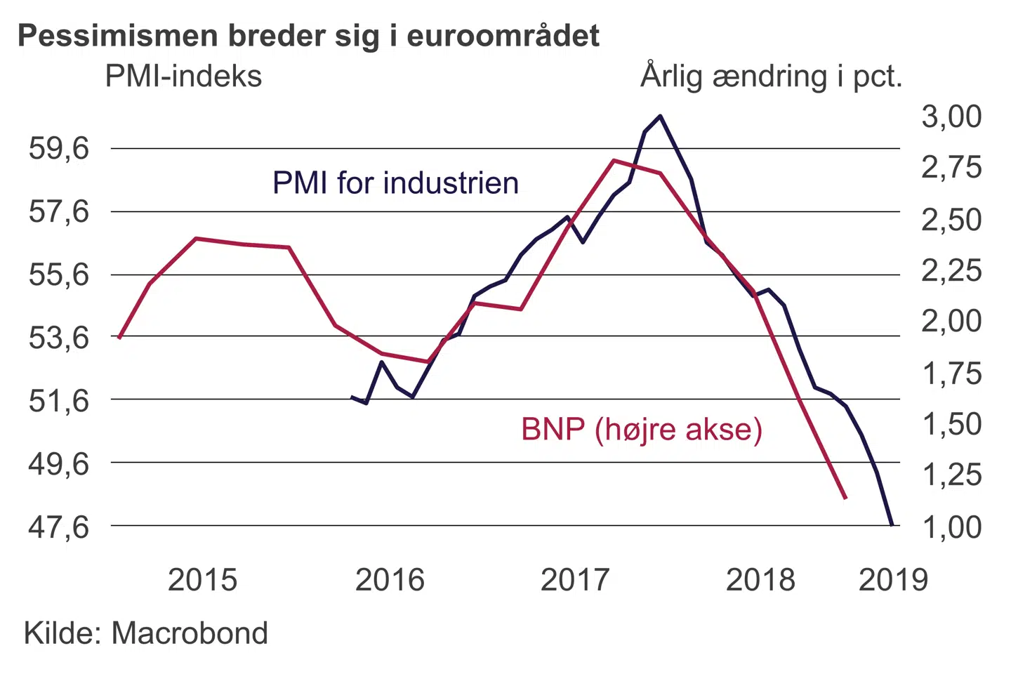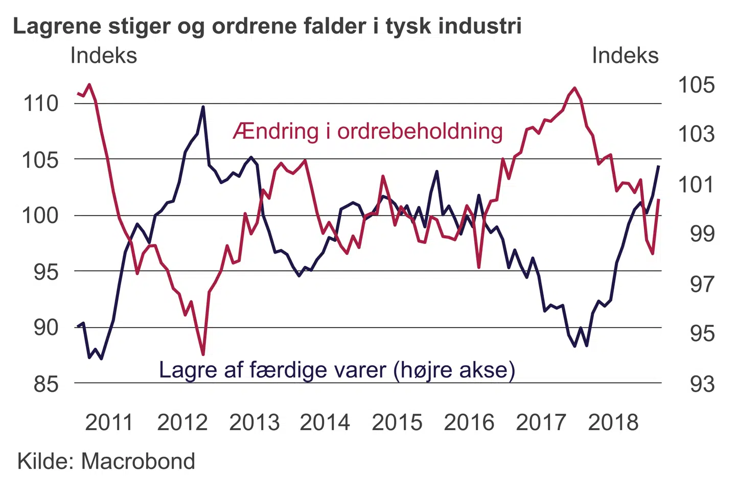 Dagens bekymrende opgørelse betyder, at der nu er endnu mere fokus på den tyske Ifo-måling for erhvervstilliden, der kommer på mandag. Her holder vi særligt øje med vurderingen af ordrebøgerne og lagrene af færdige varer. Jo flere færdiggjorde varer, der ligger på lager, desto større tilbageholdenhed i produktionen af nye varer fremadrettet. Forværringen det seneste år er endnu ikke nået samme omfang som under eurokrisen i 2011 og 2012, men der skal ikke meget til.