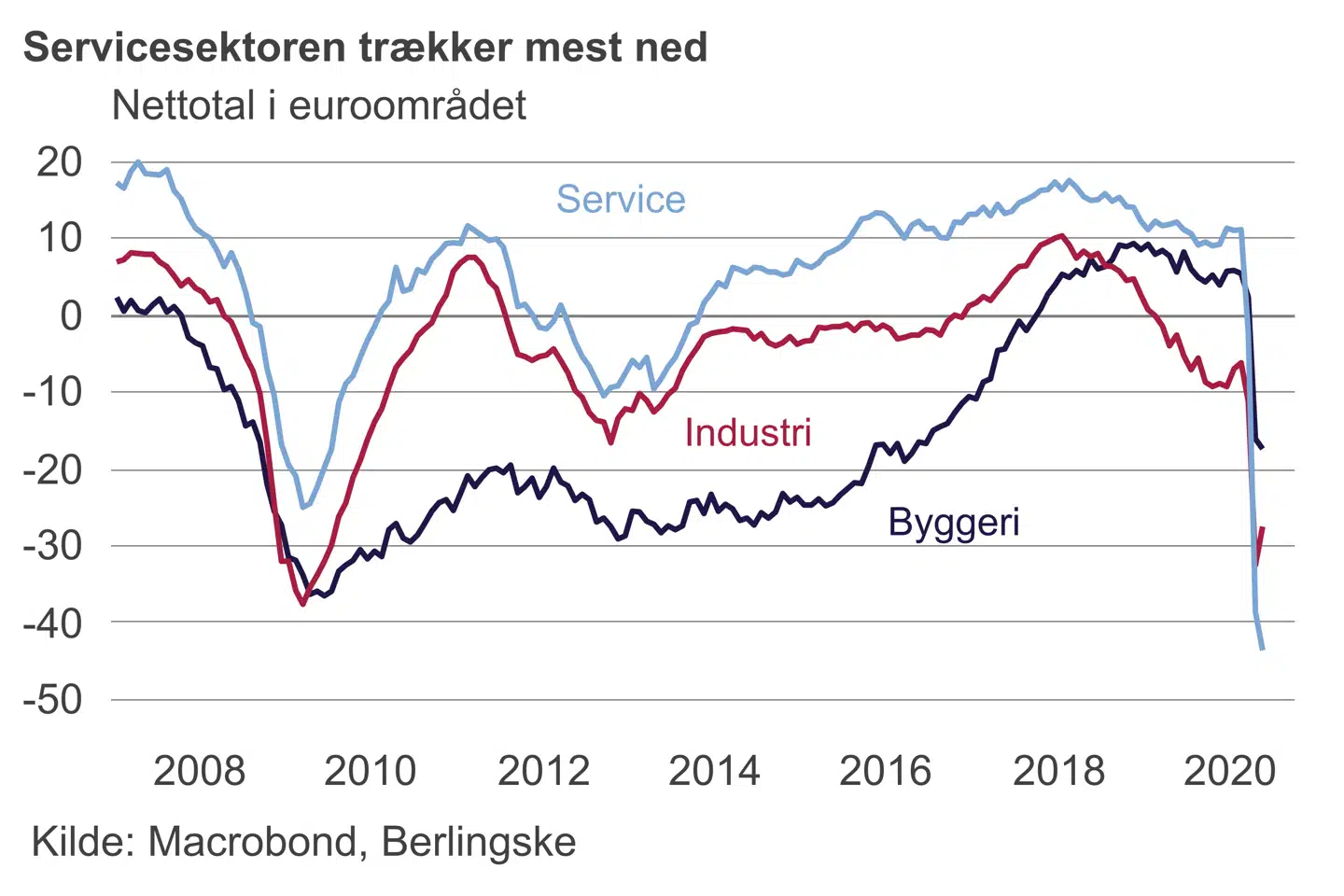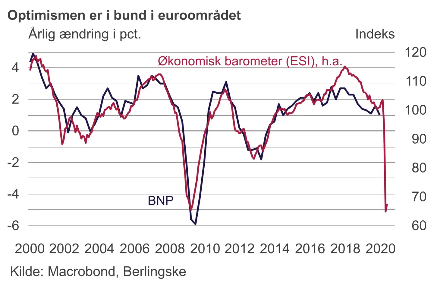Det nuværende niveau for optimismen i euroområdet peger isoleret set på et fald i bruttonationalproduktet (BNP) på fem procent i forhold til sidste år. Det er samme fald som under finanskrisen, hvor det efterfølgende opsving gav en positiv vækst på to til tre procent.