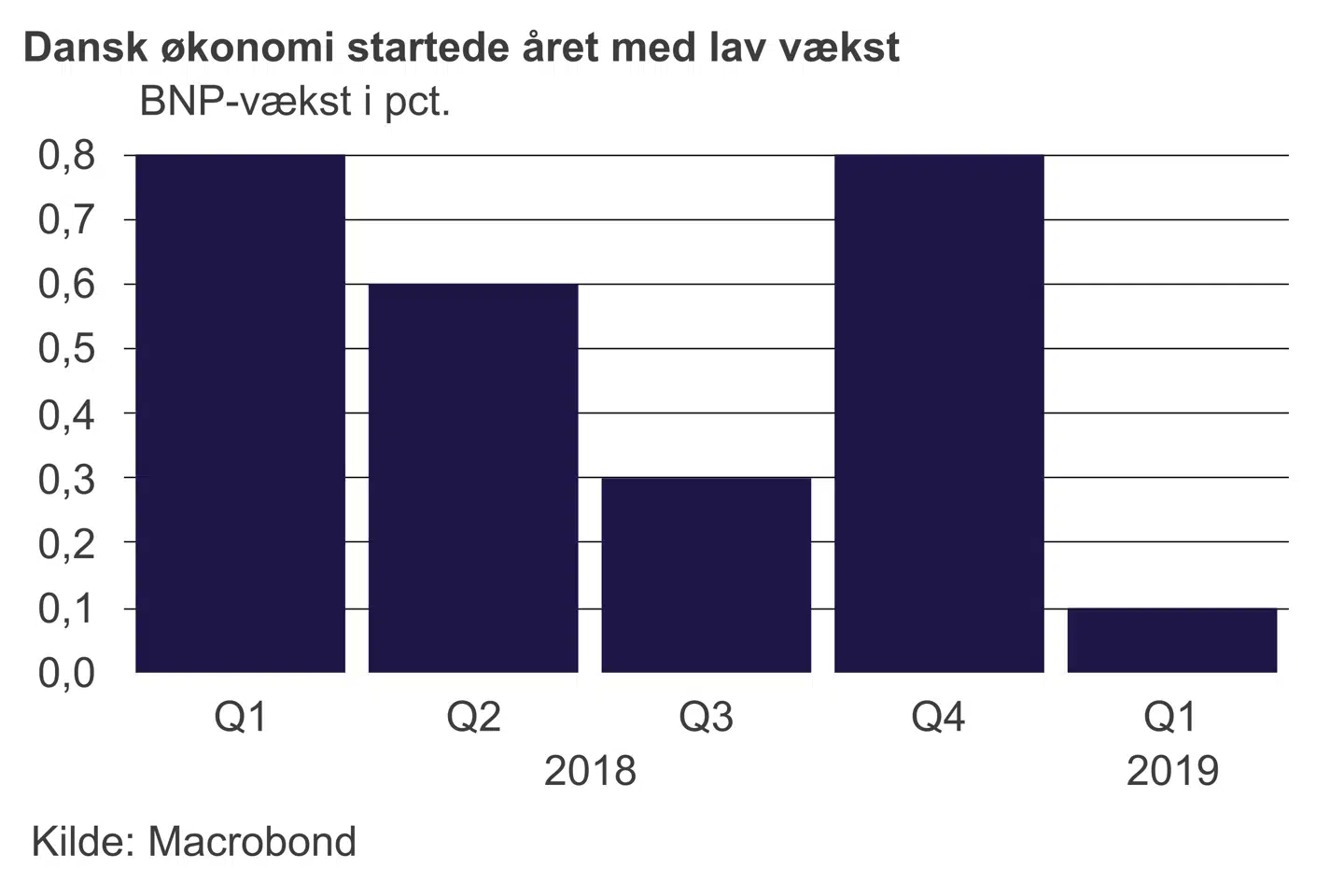 Vi skal hele syv år tilbage for at finde en lige så svag start på året. Tallene skal tages med det forbehold, at 2018 sluttede meget flot af. Derved bliver det sværere at bevare væksten i kvartalet efter. Herudover er der stor usikkerhed forbundet med væksttallene fra Danmarks Statisik. De kan stadig blive revideret.